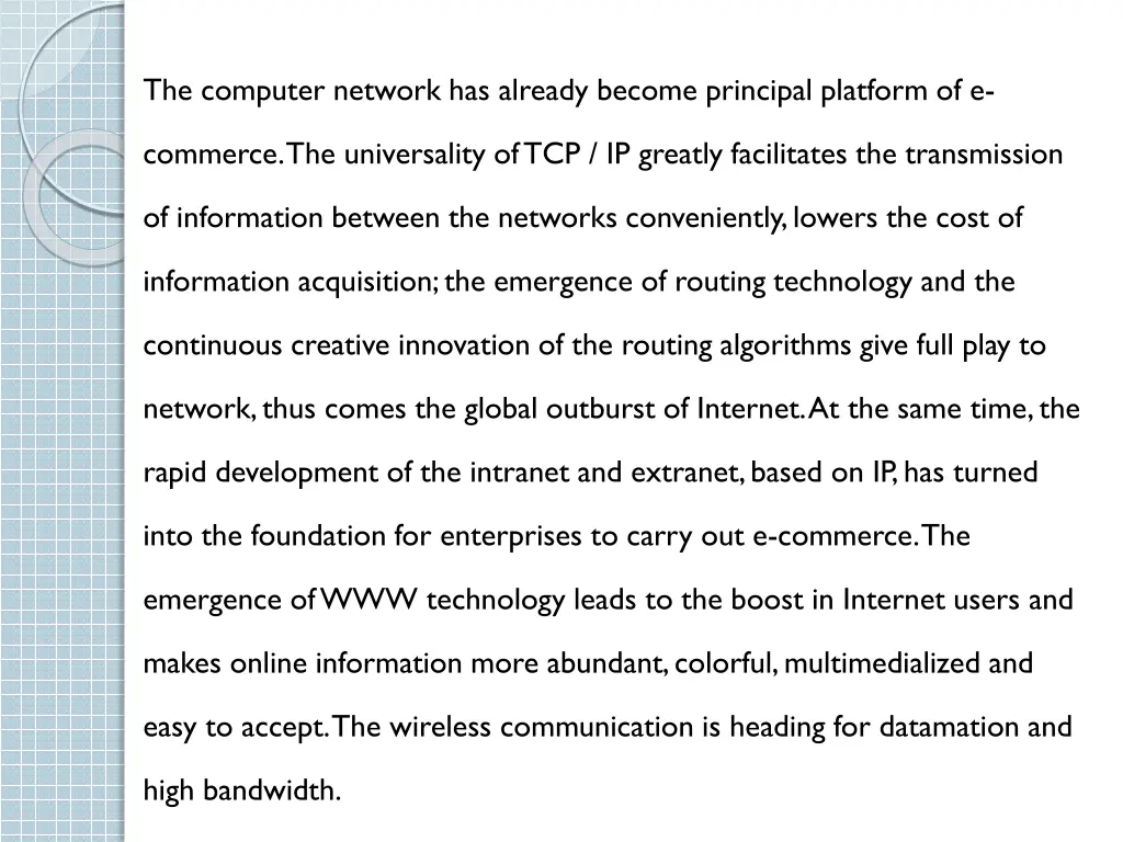 The computer network has already become principal platform of e- commerce. The universality of TCP / IP greatly facilitates the transmission of information between the networks conveniently, lowers the cost of information acquisition; the emergence of routing technology and the continuous creative innovation of the routing algorithms give full play to network, thus comes the global outburst of Internet. At the same time, the rapid development of the intranet and extranet, based on IP, has turned into the foundation for enterprises to carry out e-commerce. The emergence of WWW technology leads to the boost in Internet users and makes online information more abundant, colorful, multimedialized and easy to accept. The wireless communication is heading for datamation and high bandwidth.