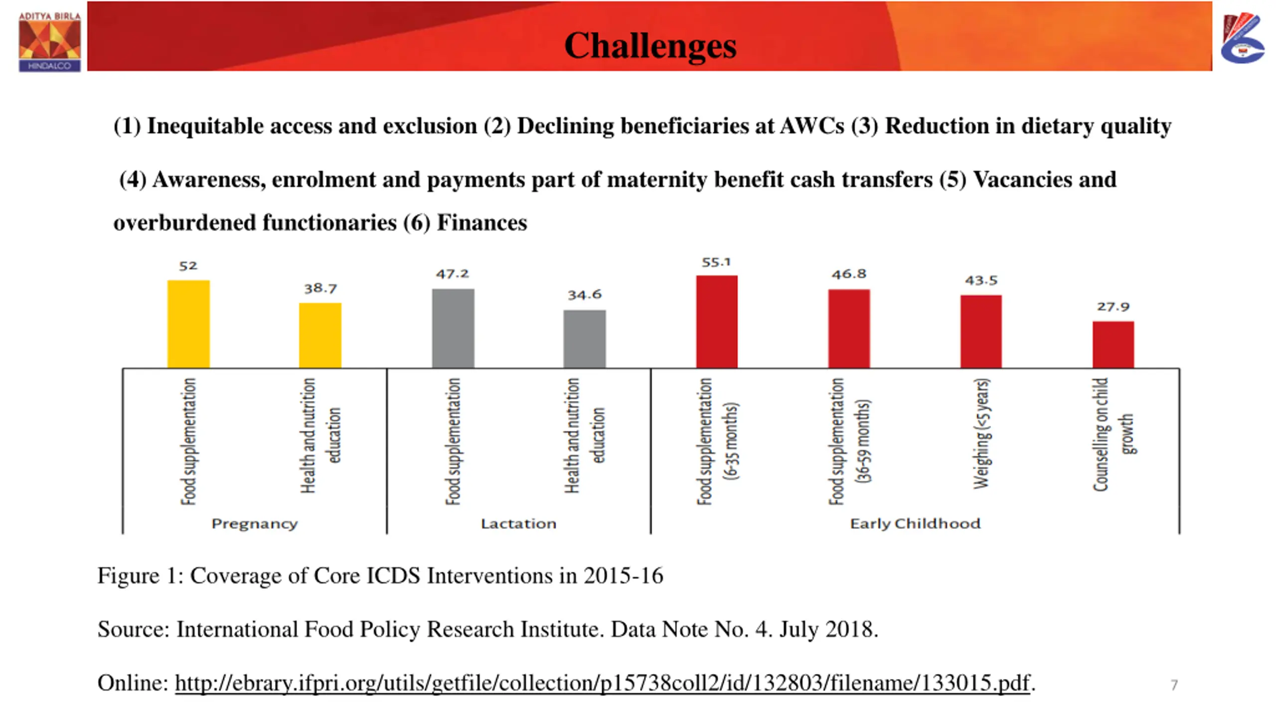 Challenges Before the pandemic, the delivery of nutrition-specific interventions was impeded by several challenges. Broadly, they can be classified into three types: Access and equity issues Bottlenecks in specific interventions, such as the delivery of food supplements Lack of an enabling environment for delivery. Coverage: On average, nationally, no major nutrition-specific intervention exceeded 70 percent even coverage in 2015-16. Coverage of interventions ranged from 65 percent for Iron and Folic Acid (IFA) during pregnancy and nutrition to just about 50 percent or less for most other interventions such as food supplements and Ante Natal Care (ANC). Consequently, most households did not receive all the nutrition interventions. For instance, Menon et al (2019) found that only two of 1,417 households (0.1 percent) received all 19 nutrition-specific and nutrition- sensitive interventions spanning various departments. In addition to low coverage across interventions, there are also significant inter-state and inter-district variations in coverage. For instance, the coverage of food supplements ranged from barely 3 percent in some districts to over 95 percent in others. 6