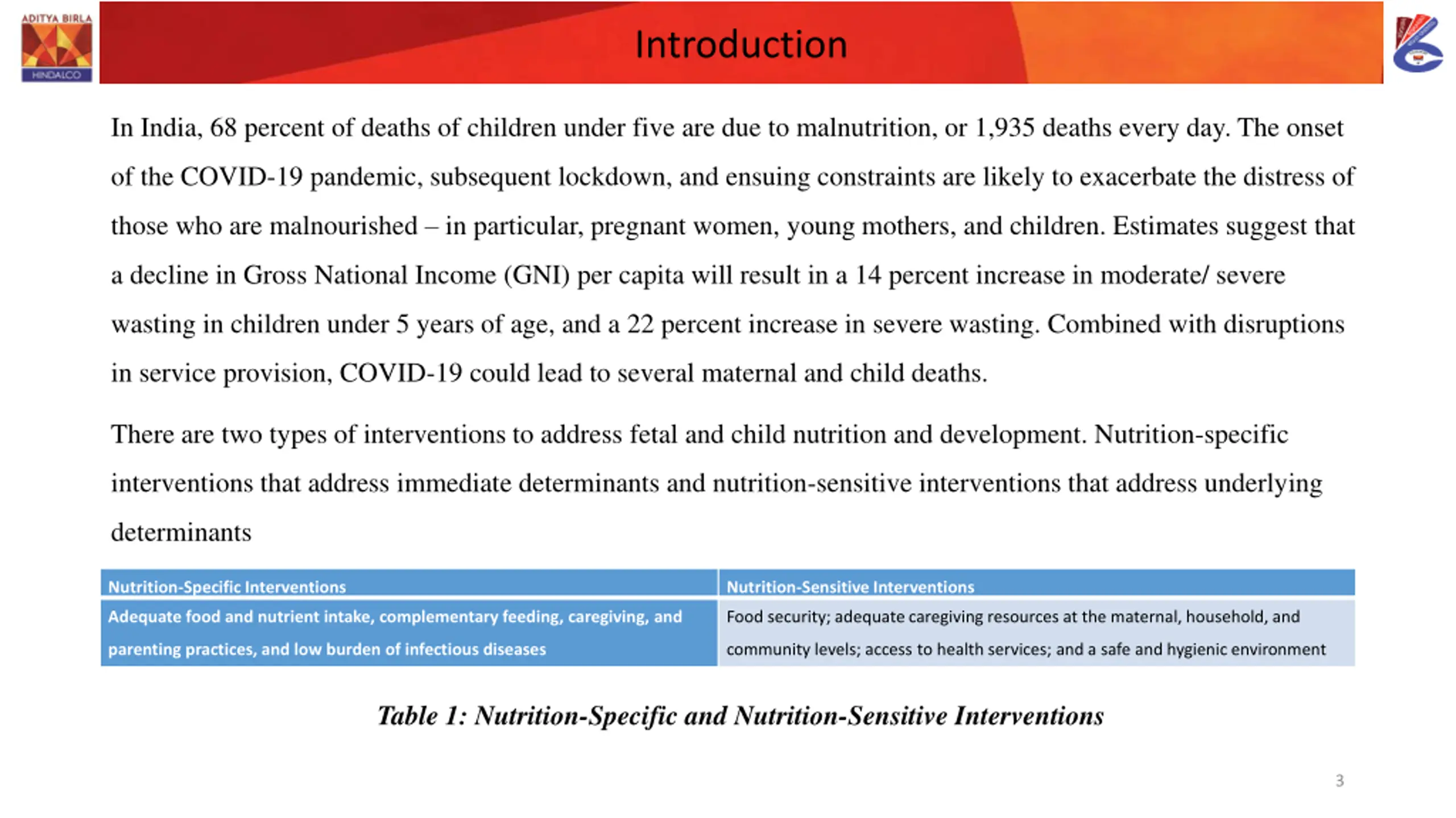 Introduction In India, 68 percent of deaths of children under five are due to malnutrition, or 1,935 deaths every day. The onset of the COVID-19 pandemic, subsequent lockdown, and ensuing constraints are likely to exacerbate the distress of those who are malnourished in particular, pregnant women, young mothers, and children. Estimates suggest that a decline in Gross National Income (GNI) per capita will result in a 14 percent increase in moderate/ severe wasting in children under 5 years of age, and a 22 percent increase in severe wasting. Combined with disruptions in service provision, COVID-19 could lead to several maternal and child deaths. There are two types of interventions to address fetal and child nutrition and development. Nutrition-specific interventions that address immediate determinants and nutrition-sensitive interventions that address underlying determinants Nutrition-Specific Interventions Nutrition-Sensitive Interventions Adequate food and nutrient intake, complementary feeding, caregiving, and Food security; adequate caregiving resources at the maternal, household, and parenting practices, and low burden of infectious diseases community levels; access to health services; and a safe and hygienic environment Table 1: Nutrition-Specific and Nutrition-Sensitive Interventions 3