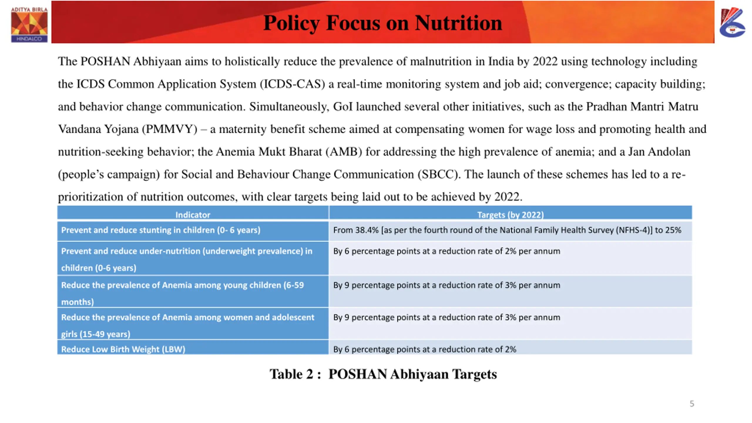 Policy Focus on Nutrition The POSHAN Abhiyaan aims to holistically reduce the prevalence of malnutrition in India by 2022 using technology including the ICDS Common Application System (ICDS-CAS) a real-time monitoring system and job aid; convergence; capacity building; and behavior change communication. Simultaneously, GoI launched several other initiatives, such as the Pradhan Mantri Matru Vandana Yojana (PMMVY) a maternity benefit scheme aimed at compensating women for wage loss and promoting health and nutrition-seeking behavior; the Anemia Mukt Bharat (AMB) for addressing the high prevalence of anemia; and a Jan Andolan (people s campaign) for Social and Behaviour Change Communication (SBCC). The launch of these schemes has led to a re- prioritization of nutrition outcomes, with clear targets being laid out to be achieved by 2022. Indicator Targets (by 2022) Prevent and reduce stunting in children (0- 6 years) From 38.4% [as per the fourth round of the National Family Health Survey (NFHS-4)] to 25% Prevent and reduce under-nutrition (underweight prevalence) in By 6 percentage points at a reduction rate of 2% per annum children (0-6 years) Reduce the prevalence of Anemia among young children (6-59 By 9 percentage points at a reduction rate of 3% per annum months) Reduce the prevalence of Anemia among women and adolescent By 9 percentage points at a reduction rate of 3% per annum girls (15-49 years) Reduce Low Birth Weight (LBW) By 6 percentage points at a reduction rate of 2% Table 2 : POSHAN Abhiyaan Targets 5