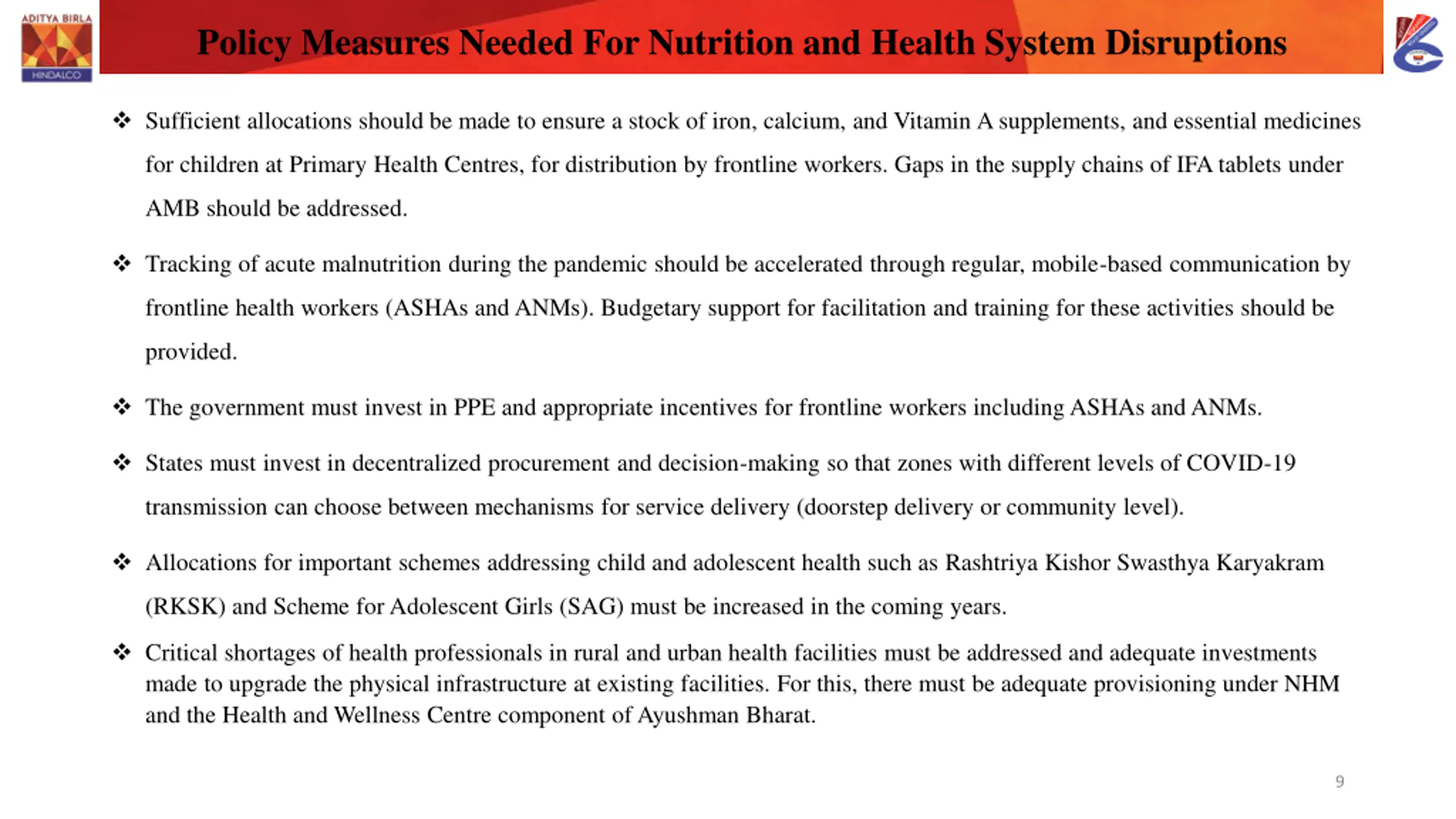 Policy Measures Needed For Nutrition and Health System Disruptions Sufficient allocations should be made to ensure a stock of iron, calcium, and Vitamin A supplements, and essential medicines for children at Primary Health Centres, for distribution by frontline workers. Gaps in the supply chains of IFA tablets under AMB should be addressed. Tracking of acute malnutrition during the pandemic should be accelerated through regular, mobile-based communication by frontline health workers (ASHAs and ANMs). Budgetary support for facilitation and training for these activities should be provided. The government must invest in PPE and appropriate incentives for frontline workers including ASHAs and ANMs. States must invest in decentralized procurement and decision-making so that zones with different levels of COVID-19 transmission can choose between mechanisms for service delivery (doorstep delivery or community level). Allocations for important schemes addressing child and adolescent health such as Rashtriya Kishor Swasthya Karyakram (RKSK) and Scheme for Adolescent Girls (SAG) must be increased in the coming years. Critical shortages of health professionals in rural and urban health facilities must be addressed and adequate investments made to upgrade the physical infrastructure at existing facilities. For this, there must be adequate provisioning under NHM and the Health and Wellness Centre component of Ayushman Bharat. 9