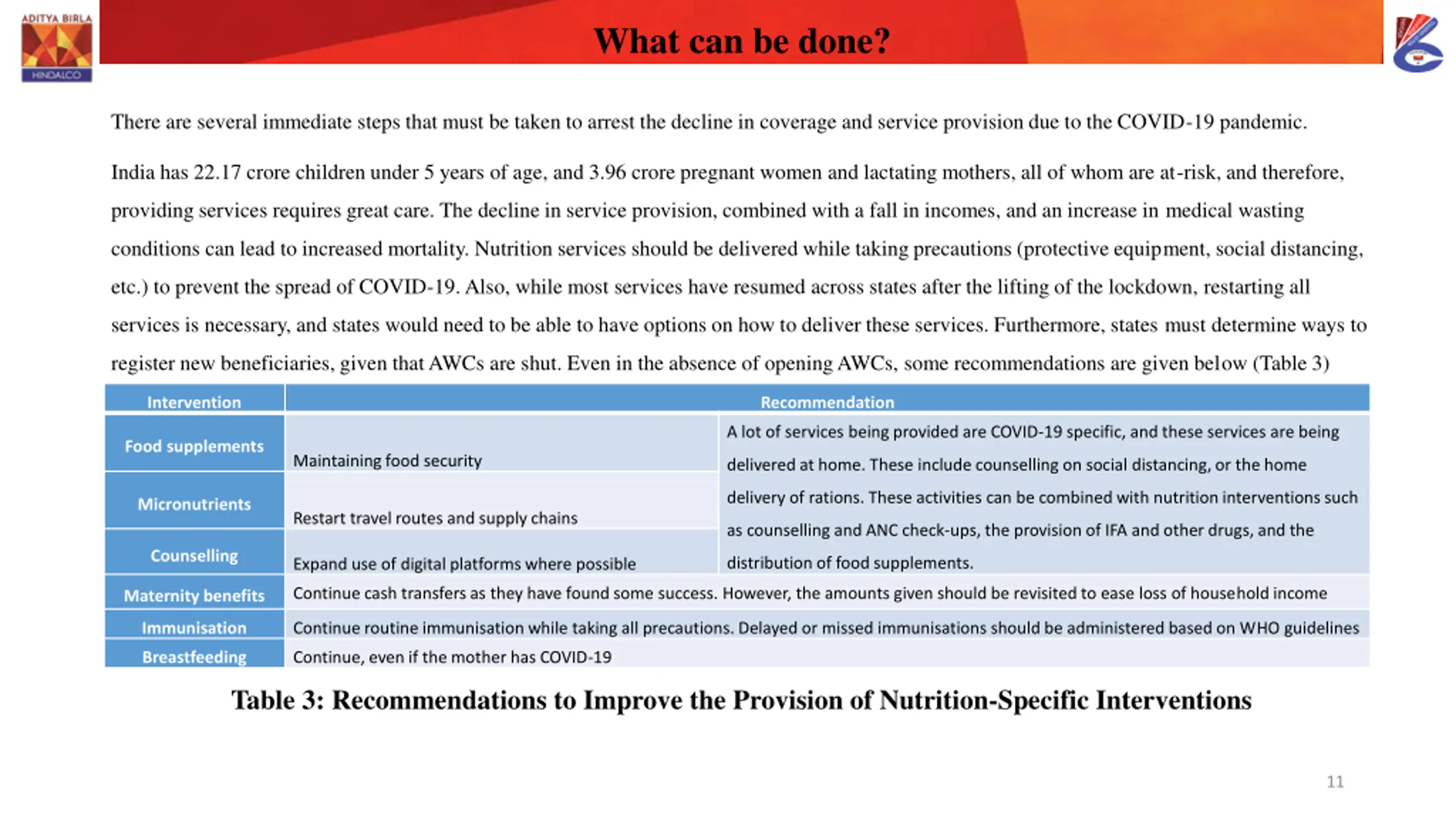What can be done? There are several immediate steps that must be taken to arrest the decline in coverage and service provision due to the COVID-19 pandemic. India has 22.17 crore children under 5 years of age, and 3.96 crore pregnant women and lactating mothers, all of whom are at-risk, and therefore, providing services requires great care. The decline in service provision, combined with a fall in incomes, and an increase in medical wasting conditions can lead to increased mortality. Nutrition services should be delivered while taking precautions (protective equipment, social distancing, etc.) to prevent the spread of COVID-19. Also, while most services have resumed across states after the lifting of the lockdown, restarting all services is necessary, and states would need to be able to have options on how to deliver these services. Furthermore, states must determine ways to register new beneficiaries, given that AWCs are shut. Even in the absence of opening AWCs, some recommendations are given below (Table 3) Intervention Recommendation A lot of services being provided are COVID-19 specific, and these services are being Food supplements Maintaining food security delivered at home. These include counselling on social distancing, or the home delivery of rations. These activities can be combined with nutrition interventions such Micronutrients Restart travel routes and supply chains as counselling and ANC check-ups, the provision of IFA and other drugs, and the Counselling distribution of food supplements. Expand use of digital platforms where possible Continue cash transfers as they have found some success. However, the amounts given should be revisited to ease loss of household income Maternity benefits Immunisation Continue routine immunisation while taking all precautions. Delayed or missed immunisations should be administered based on WHO guidelines Breastfeeding Continue, even if the mother has COVID-19 Table 3: Recommendations to Improve the Provision of Nutrition-Specific Interventions 11