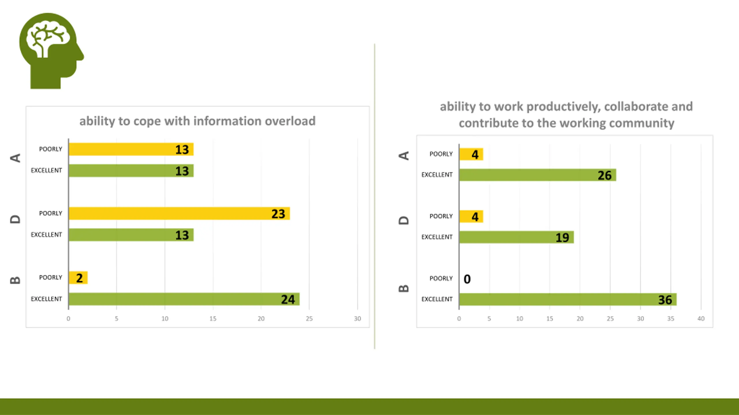 ability to work productively, collaborate and contribute to the working community ability to cope with information overload 13 POORLY 4 POORLY B D A B D A 13 EXCELLENT 26 EXCELLENT 23 POORLY 4 POORLY 13 19 EXCELLENT EXCELLENT 2 0 POORLY POORLY 24 36 EXCELLENT EXCELLENT 0 5 10 15 20 25 30 0 5 10 15 20 25 30 35 40
