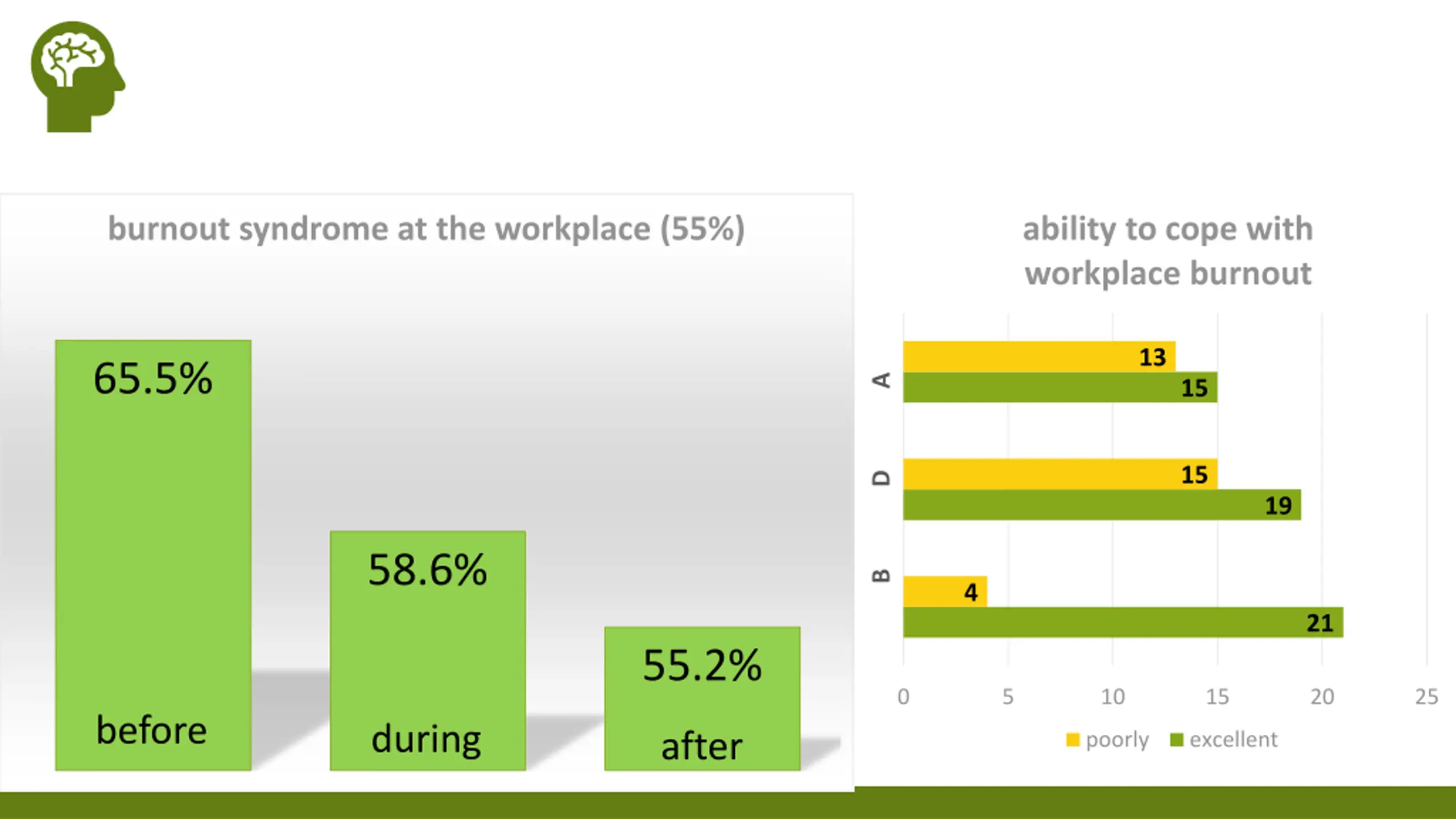 burnout syndrome at the workplace (55%) ability to cope with workplace burnout 13 65.5% B D A 15 15 19 58.6% 4 21 55.2% 0 5 10 15 20 25 before during after poorly excellent