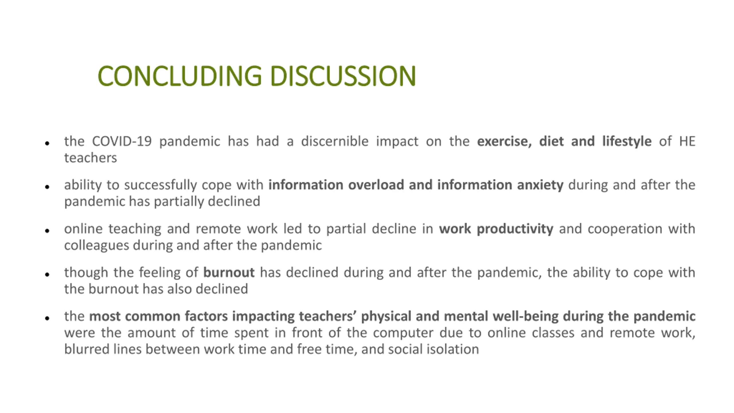 CONCLUDING DISCUSSION CONCLUDING DISCUSSION the COVID-19 pandemic has had a discernible impact on the exercise, diet and lifestyle of HE teachers ability to successfully cope with information overload and information anxiety during and after the pandemic has partially declined online teaching and remote work led to partial decline in work productivity and cooperation with colleagues during and after the pandemic though the feeling of burnout has declined during and after the pandemic, the ability to cope with the burnout has also declined the most common factors impacting teachers physical and mental well-being during the pandemic were the amount of time spent in front of the computer due to online classes and remote work, blurred lines between work time and free time, and social isolation