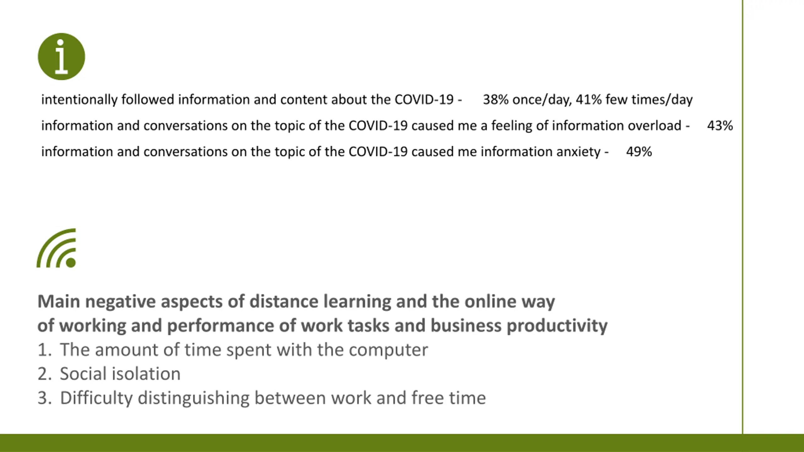 intentionally followed information and content about the COVID-19 - 38% once/day, 41% few times/day information and conversations on the topic of the COVID-19 caused me a feeling of information overload - 43% information and conversations on the topic of the COVID-19 caused me information anxiety - 49% % Main negative aspects of distance learning and the online way of working and performance of work tasks and business productivity 1. The amount of time spent with the computer 2. Social isolation 3. Difficulty distinguishing between work and free time
