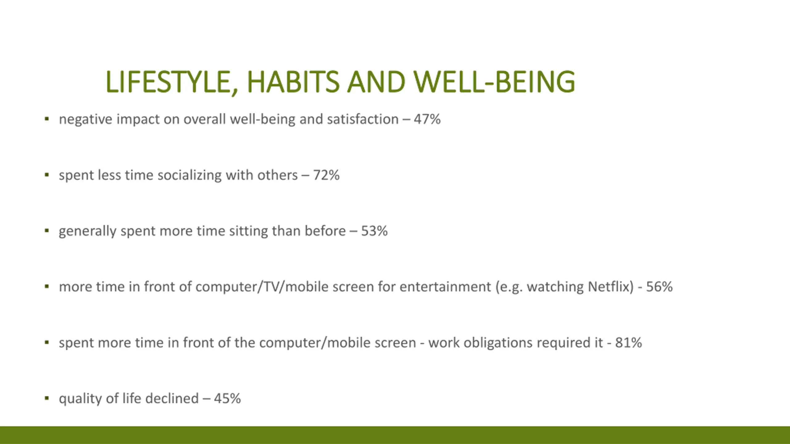 LIFESTYLE, HABITS LIFESTYLE, HABITS AND AND WELL WELL- -BEING BEING negative impact on overall well-being and satisfaction 47% spent less time socializing with others 72% generally spent more time sitting than before 53% more time in front of computer/TV/mobile screen for entertainment (e.g. watching Netflix) - 56% spent more time in front of the computer/mobile screen - work obligations required it - 81% quality of life declined 45%