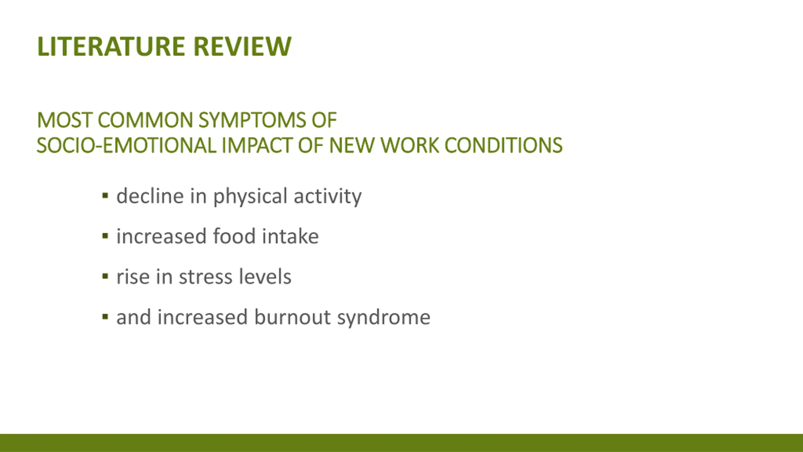LITERATURE REVIEW MOST COMMON SYMPTOMS OF MOST COMMON SYMPTOMS OF SOCIO SOCIO- -EMOTIONAL EMOTIONAL IMPACT OF NEW WORK CONDITIONS IMPACT OF NEW WORK CONDITIONS decline in physical activity increased food intake rise in stress levels and increased burnout syndrome