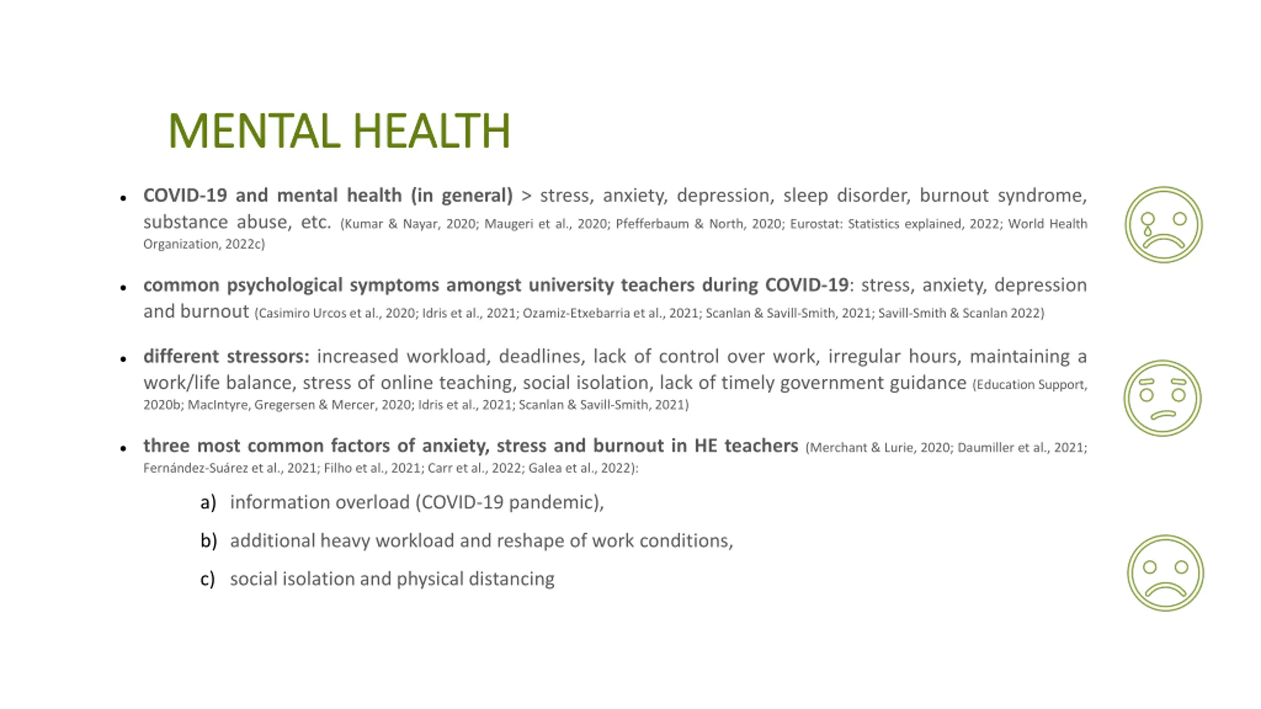 MENTAL HEALTH MENTAL HEALTH COVID-19 and mental health (in general) > stress, anxiety, depression, sleep disorder, burnout syndrome, substance abuse, etc. (Kumar & Nayar, 2020; Maugeri et al., 2020; Pfefferbaum & North, 2020; Eurostat: Statistics explained, 2022; World Health Organization, 2022c) common psychological symptoms amongst university teachers during COVID-19: stress, anxiety, depression and burnout (Casimiro Urcos et al., 2020; Idris et al., 2021; Ozamiz-Etxebarria et al., 2021; Scanlan & Savill-Smith, 2021; Savill-Smith & Scanlan 2022) different stressors: increased workload, deadlines, lack of control over work, irregular hours, maintaining a work/life balance, stress of online teaching, social isolation, lack of timely government guidance (Education Support, 2020b; MacIntyre, Gregersen & Mercer, 2020; Idris et al., 2021; Scanlan & Savill-Smith, 2021) three most common factors of anxiety, stress and burnout in HE teachers(Merchant & Lurie, 2020; Daumiller et al., 2021; Fern ndez-Su rez et al., 2021; Filho et al., 2021; Carr et al., 2022; Galea et al., 2022): a) information overload (COVID-19 pandemic), b) additional heavy workload and reshape of work conditions, c) social isolation and physical distancing