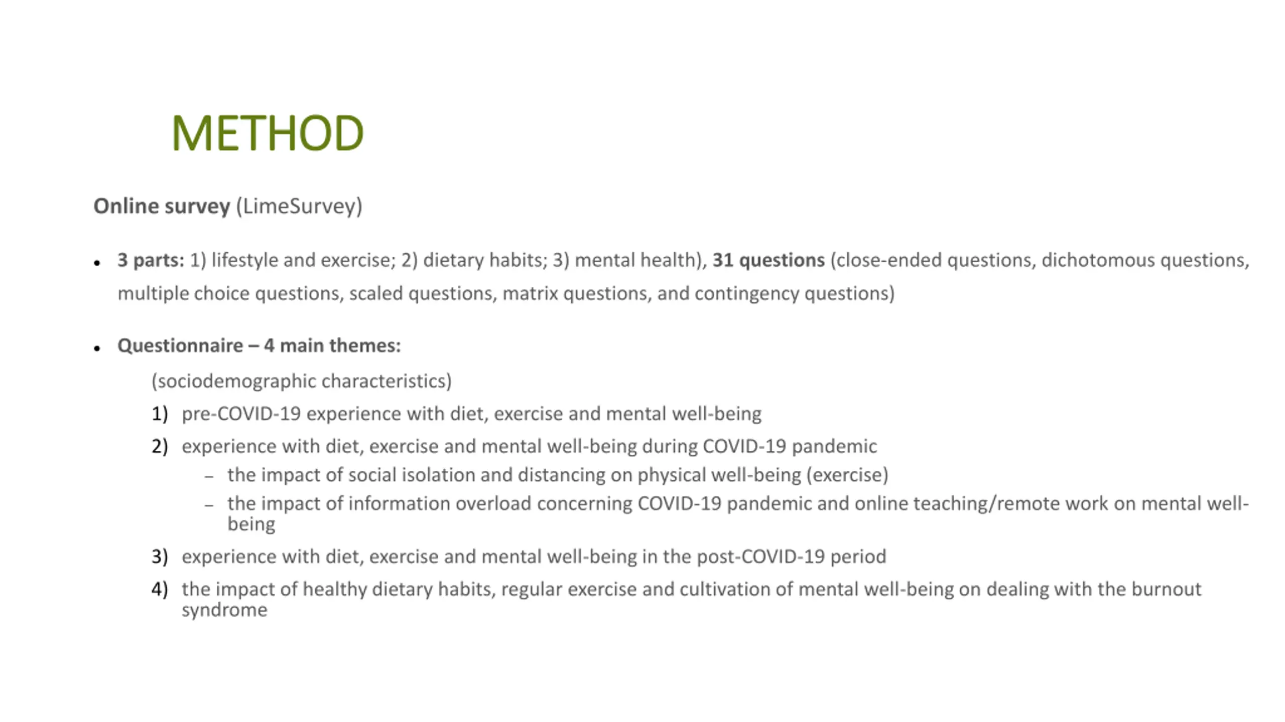 METHOD METHOD Online survey (LimeSurvey) 3 parts: 1) lifestyle and exercise; 2) dietary habits; 3) mental health), 31 questions (close-ended questions, dichotomous questions, multiple choice questions, scaled questions, matrix questions, and contingency questions) Questionnaire 4 main themes: (sociodemographic characteristics) 1) pre-COVID-19 experience with diet, exercise and mental well-being 2) experience with diet, exercise and mental well-being during COVID-19 pandemic the impact of social isolation and distancing on physical well-being (exercise) the impact of information overload concerning COVID-19 pandemic and online teaching/remote work on mental well- being 3) experience with diet, exercise and mental well-being in the post-COVID-19 period 4) the impact of healthy dietary habits, regular exercise and cultivation of mental well-being on dealing with the burnout syndrome