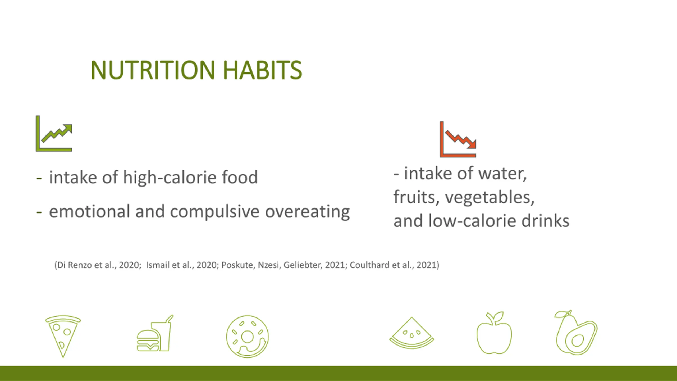 NUTRITION HABITS NUTRITION HABITS - intake of water, fruits, vegetables, and low-calorie drinks - intake of high-calorie food - emotional and compulsive overeating (Di Renzo et al., 2020; Ismail et al., 2020; Poskute, Nzesi, Geliebter, 2021; Coulthard et al., 2021)