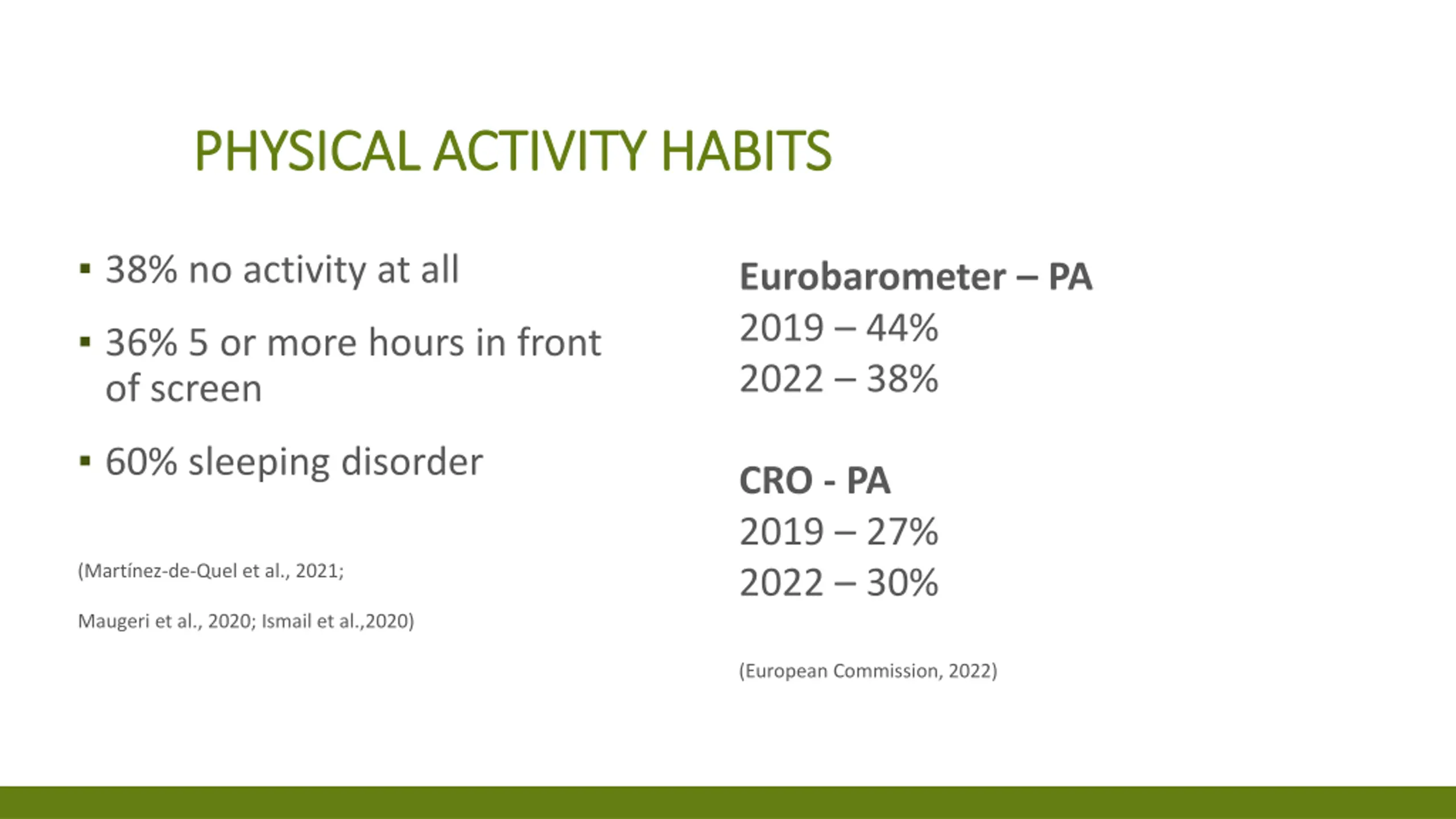 PHYSICAL PHYSICAL ACTIVITY ACTIVITY HABITS HABITS 38% no activity at all Eurobarometer PA 2019 44% 2022 38% 36% 5 or more hours in front of screen 60% sleeping disorder CRO - PA 2019 27% 2022 30% (Mart nez-de-Quel et al., 2021; Maugeri et al., 2020; Ismail et al.,2020) (European Commission, 2022)