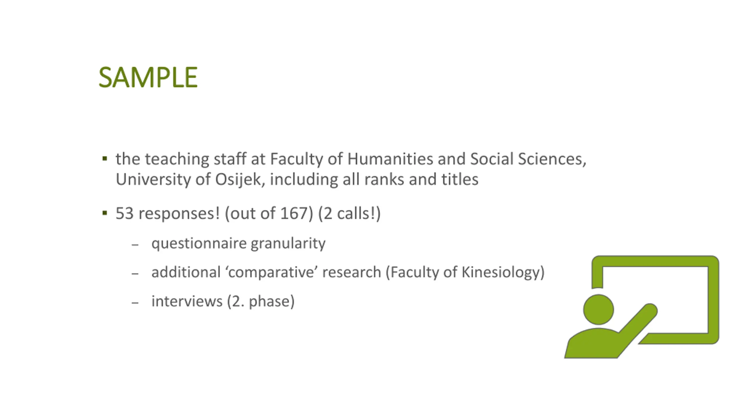 SAMPLE SAMPLE the teaching staff at Faculty of Humanities and Social Sciences, University of Osijek, including all ranks and titles 53 responses! (out of 167) (2 calls!) questionnaire granularity additional comparative research (Faculty of Kinesiology) interviews (2. phase)