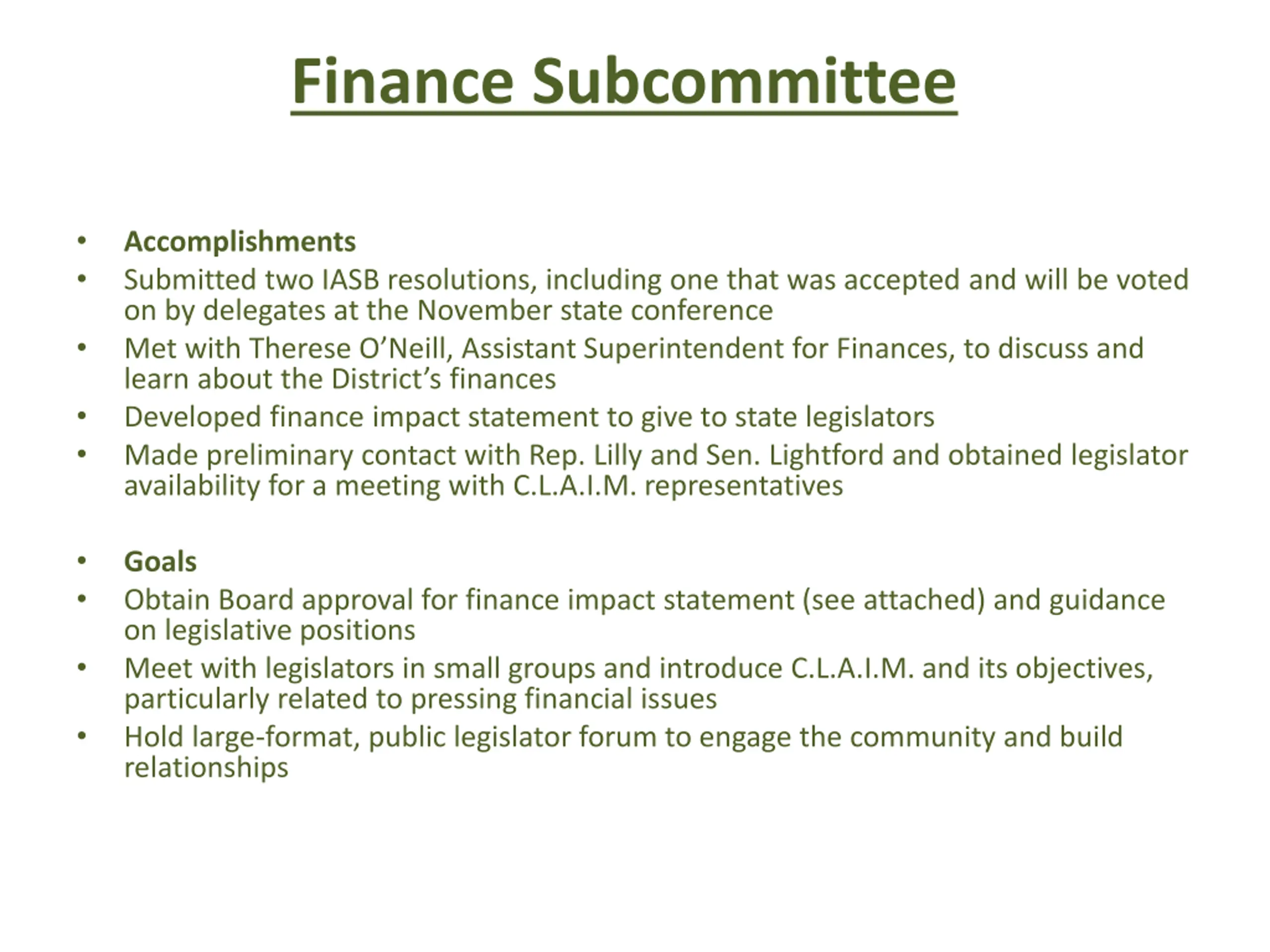 Finance Subcommittee Accomplishments Submitted two IASB resolutions, including one that was accepted and will be voted on by delegates at the November state conference Met with Therese O Neill, Assistant Superintendent for Finances, to discuss and learn about the District s finances Developed finance impact statement to give to state legislators Made preliminary contact with Rep. Lilly and Sen. Lightford and obtained legislator availability for a meeting with C.L.A.I.M. representatives Goals Obtain Board approval for finance impact statement (see attached) and guidance on legislative positions Meet with legislators in small groups and introduce C.L.A.I.M. and its objectives, particularly related to pressing financial issues Hold large-format, public legislator forum to engage the community and build relationships