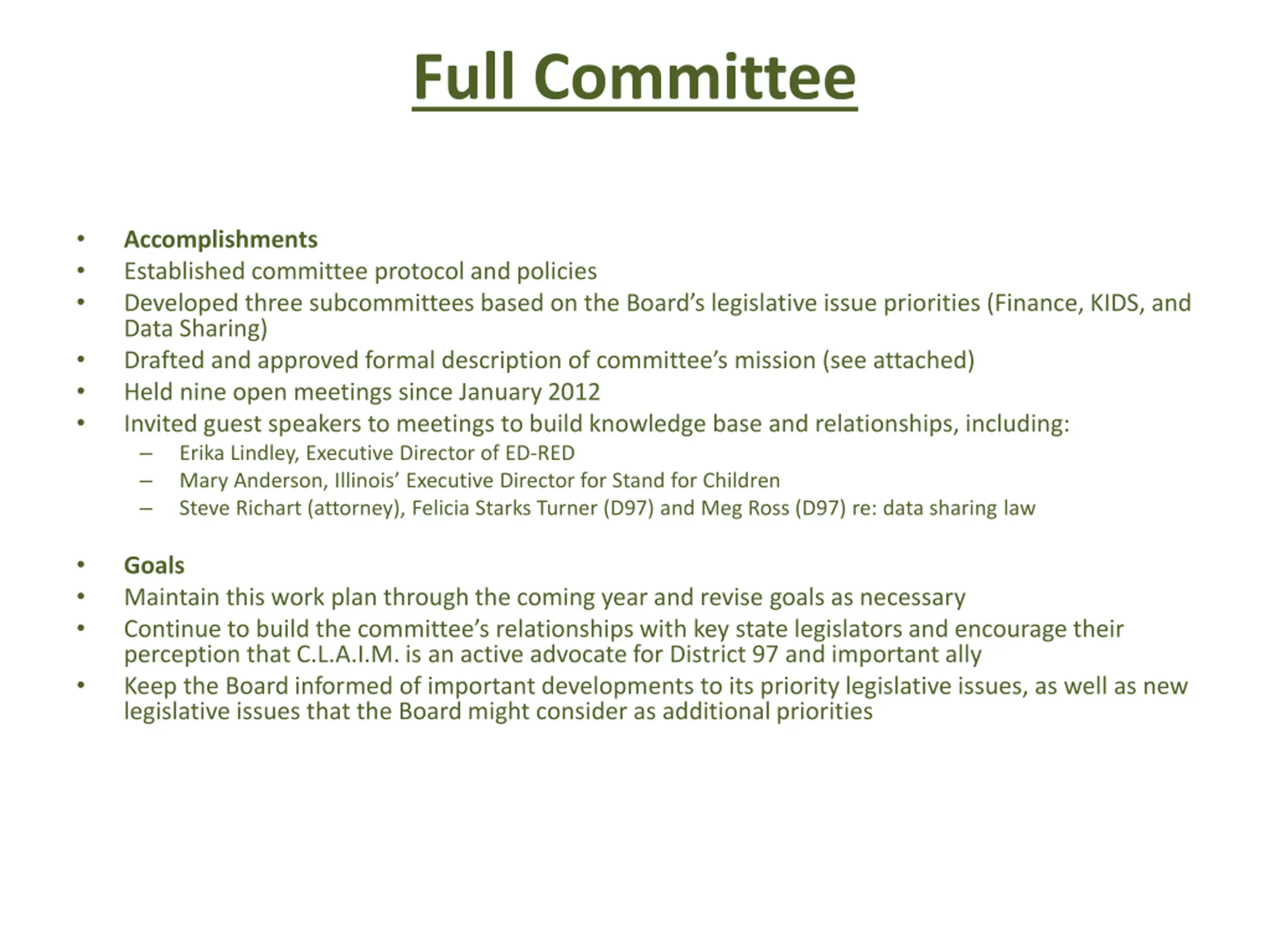 Full Committee Accomplishments Established committee protocol and policies Developed three subcommittees based on the Board s legislative issue priorities (Finance, KIDS, and Data Sharing) Drafted and approved formal description of committee s mission (see attached) Held nine open meetings since January 2012 Invited guest speakers to meetings to build knowledge base and relationships, including: Erika Lindley, Executive Director of ED-RED Mary Anderson, Illinois Executive Director for Stand for Children Steve Richart (attorney), Felicia Starks Turner (D97) and Meg Ross (D97) re: data sharing law Goals Maintain this work plan through the coming year and revise goals as necessary Continue to build the committee s relationships with key state legislators and encourage their perception that C.L.A.I.M. is an active advocate for District 97 and important ally Keep the Board informed of important developments to its priority legislative issues, as well as new legislative issues that the Board might consider as additional priorities