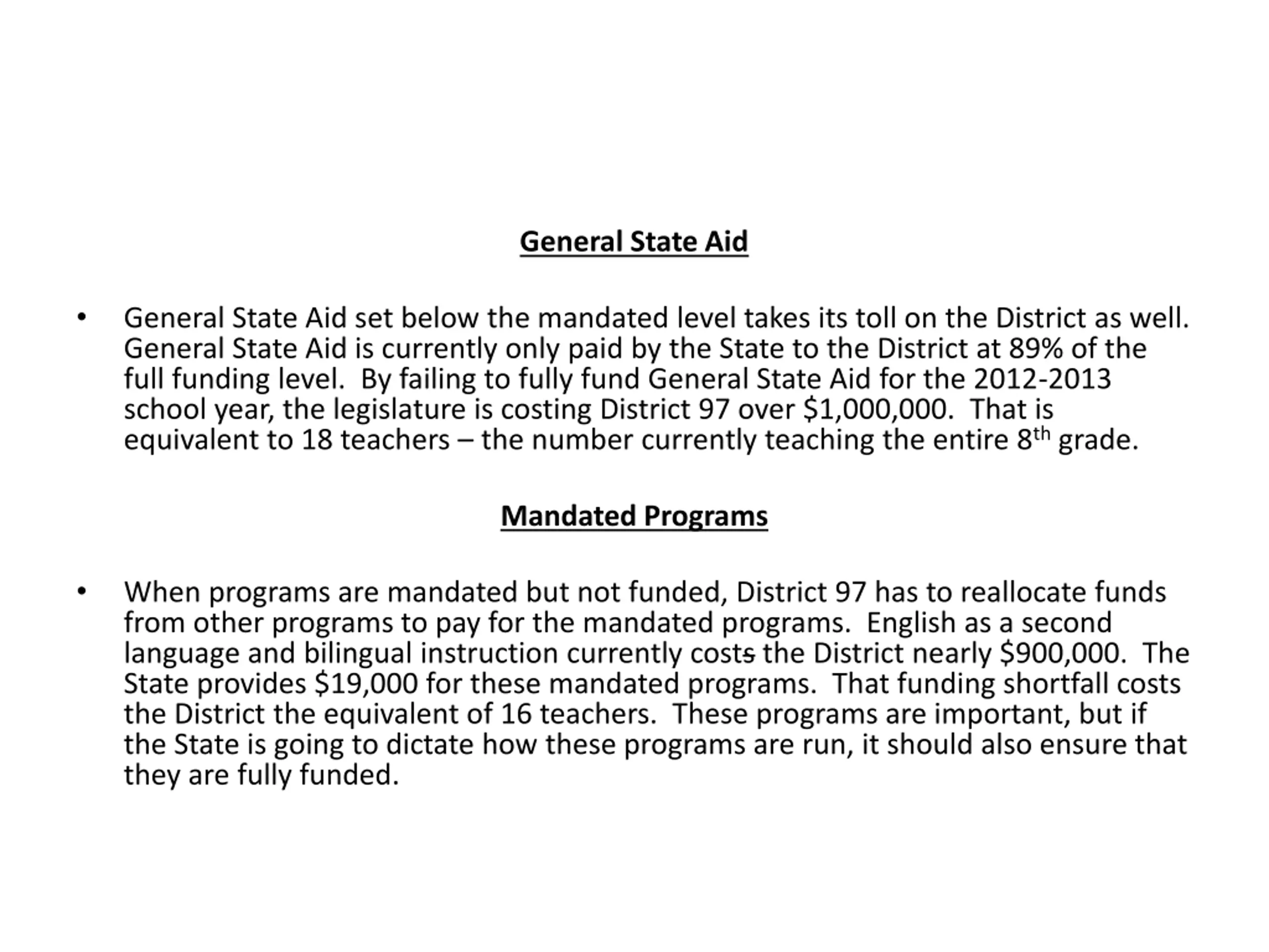 General State Aid General State Aid set below the mandated level takes its toll on the District as well. General State Aid is currently only paid by the State to the District at 89% of the full funding level. By failing to fully fund General State Aid for the 2012-2013 school year, the legislature is costing District 97 over $1,000,000. That is equivalent to 18 teachers the number currently teaching the entire 8thgrade. Mandated Programs When programs are mandated but not funded, District 97 has to reallocate funds from other programs to pay for the mandated programs. English as a second language and bilingual instruction currently costs the District nearly $900,000. The State provides $19,000 for these mandated programs. That funding shortfall costs the District the equivalent of 16 teachers. These programs are important, but if the State is going to dictate how these programs are run, it should also ensure that they are fully funded.
