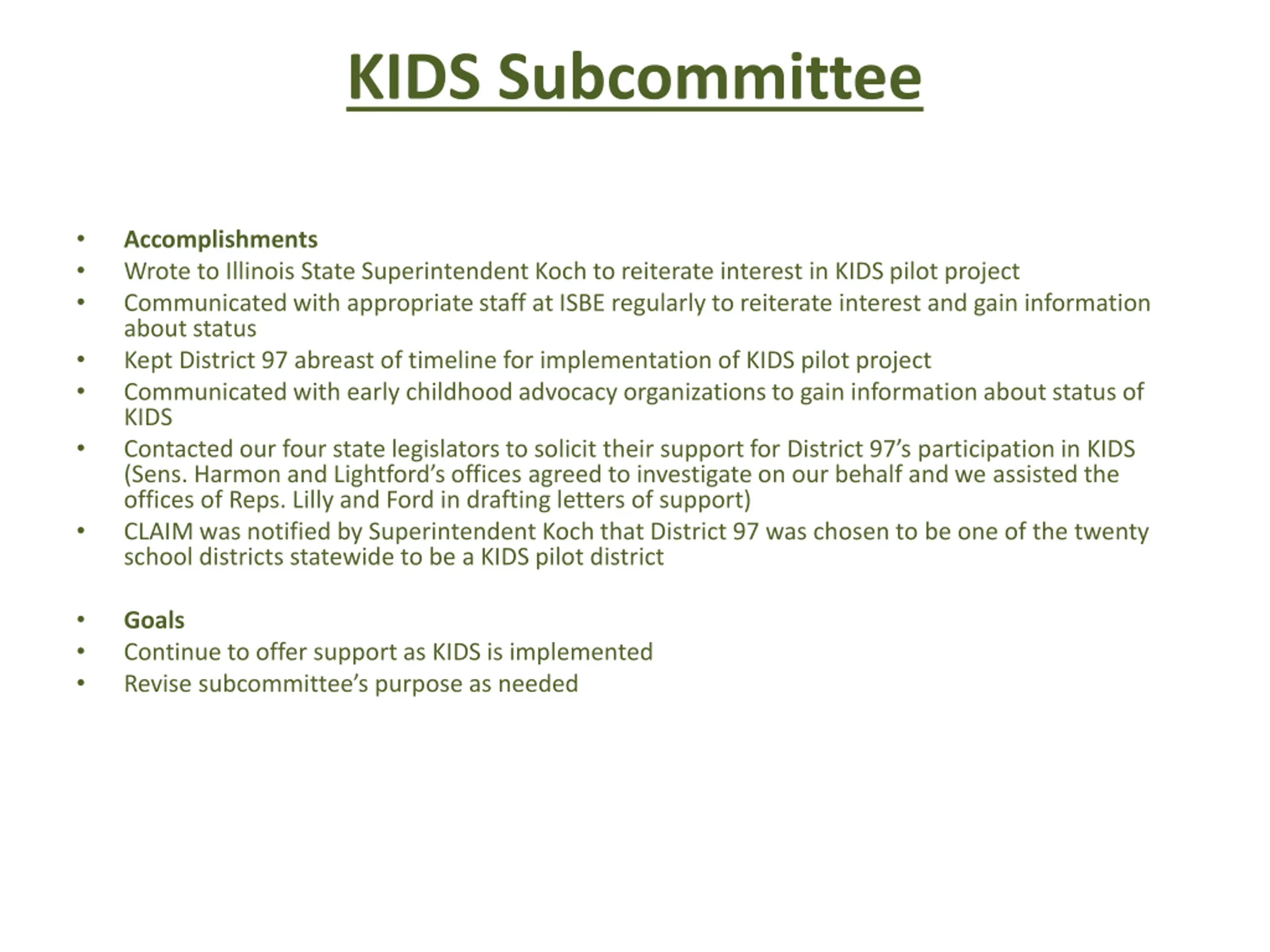KIDS Subcommittee Accomplishments Wrote to Illinois State Superintendent Koch to reiterate interest in KIDS pilot project Communicated with appropriate staff at ISBE regularly to reiterate interest and gain information about status Kept District 97 abreast of timeline for implementation of KIDS pilot project Communicated with early childhood advocacy organizations to gain information about status of KIDS Contacted our four state legislators to solicit their support for District 97 s participation in KIDS (Sens. Harmon and Lightford s offices agreed to investigate on our behalf and we assisted the offices of Reps. Lilly and Ford in drafting letters of support) CLAIM was notified by Superintendent Koch that District 97 was chosen to be one of the twenty school districts statewide to be a KIDS pilot district Goals Continue to offer support as KIDS is implemented Revise subcommittee s purpose as needed