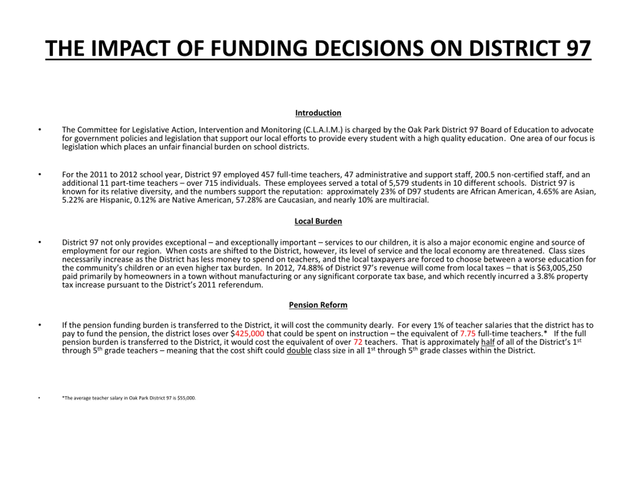 THE IMPACT OF FUNDING DECISIONS ON DISTRICT 97 Introduction The Committee for Legislative Action, Intervention and Monitoring (C.L.A.I.M.) is charged by the Oak Park District 97 Board of Education to advocate for government policies and legislation that support our local efforts to provide every student with a high quality education. One area of our focus is legislation which places an unfair financial burden on school districts. For the 2011 to 2012 school year, District 97 employed 457 full-time teachers, 47 administrative and support staff, 200.5 non-certified staff, and an additional 11 part-time teachers over 715 individuals. These employees served a total of 5,579 students in 10 different schools. District 97 is known for its relative diversity, and the numbers support the reputation: approximately 23% of D97 students are African American, 4.65% are Asian, 5.22% are Hispanic, 0.12% are Native American, 57.28% are Caucasian, and nearly 10% are multiracial. Local Burden District 97 not only provides exceptional and exceptionally important services to our children, it is also a major economic engine and source of employment for our region. When costs are shifted to the District, however, its level of service and the local economy are threatened. Class sizes necessarily increase as the District has less money to spend on teachers, and the local taxpayers are forced to choose between a worse education for the community s children or an even higher tax burden. In 2012, 74.88% of District 97 s revenue will come from local taxes that is $63,005,250 paid primarily by homeowners in a town without manufacturing or any significant corporate tax base, and which recently incurred a 3.8% property tax increase pursuant to the District s 2011 referendum. Pension Reform If the pension funding burden is transferred to the District, it will cost the community dearly. For every 1% of teacher salaries that the district has to pay to fund the pension, the district loses over $425,000 that could be spent on instruction the equivalent of 7.75 full-time teachers.* If the full pension burden is transferred to the District, it would cost the equivalent of over 72 teachers. That is approximately half of all of the District s 1st through 5thgrade teachers meaning that the cost shift could double class size in all 1stthrough 5thgrade classes within the District. *The average teacher salary in Oak Park District 97 is $55,000.