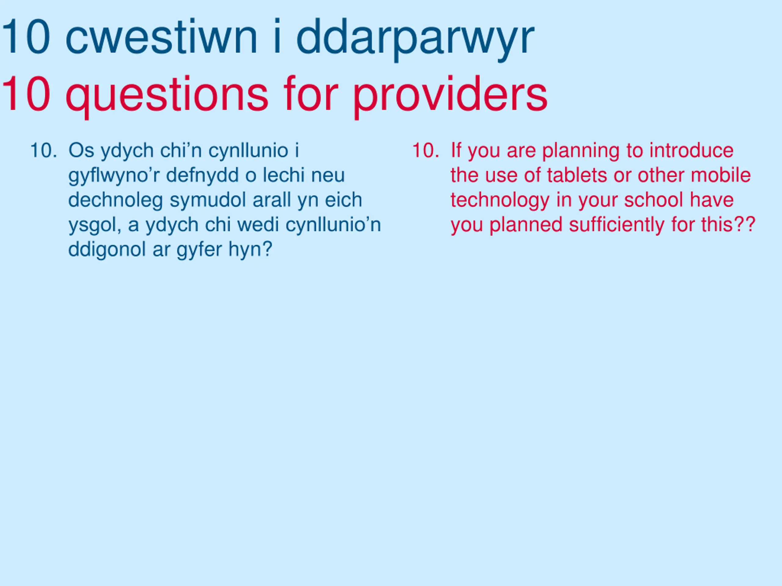 10 cwestiwn i ddarparwyr 10 questions for providers 10. Os ydych chi n cynllunio i gyflwyno r defnydd o lechi neu dechnoleg symudol arall yn eich ysgol, a ydych chi wedi cynllunio n ddigonol ar gyfer hyn? 10. If you are planning to introduce the use of tablets or other mobile technology in your school have you planned sufficiently for this??