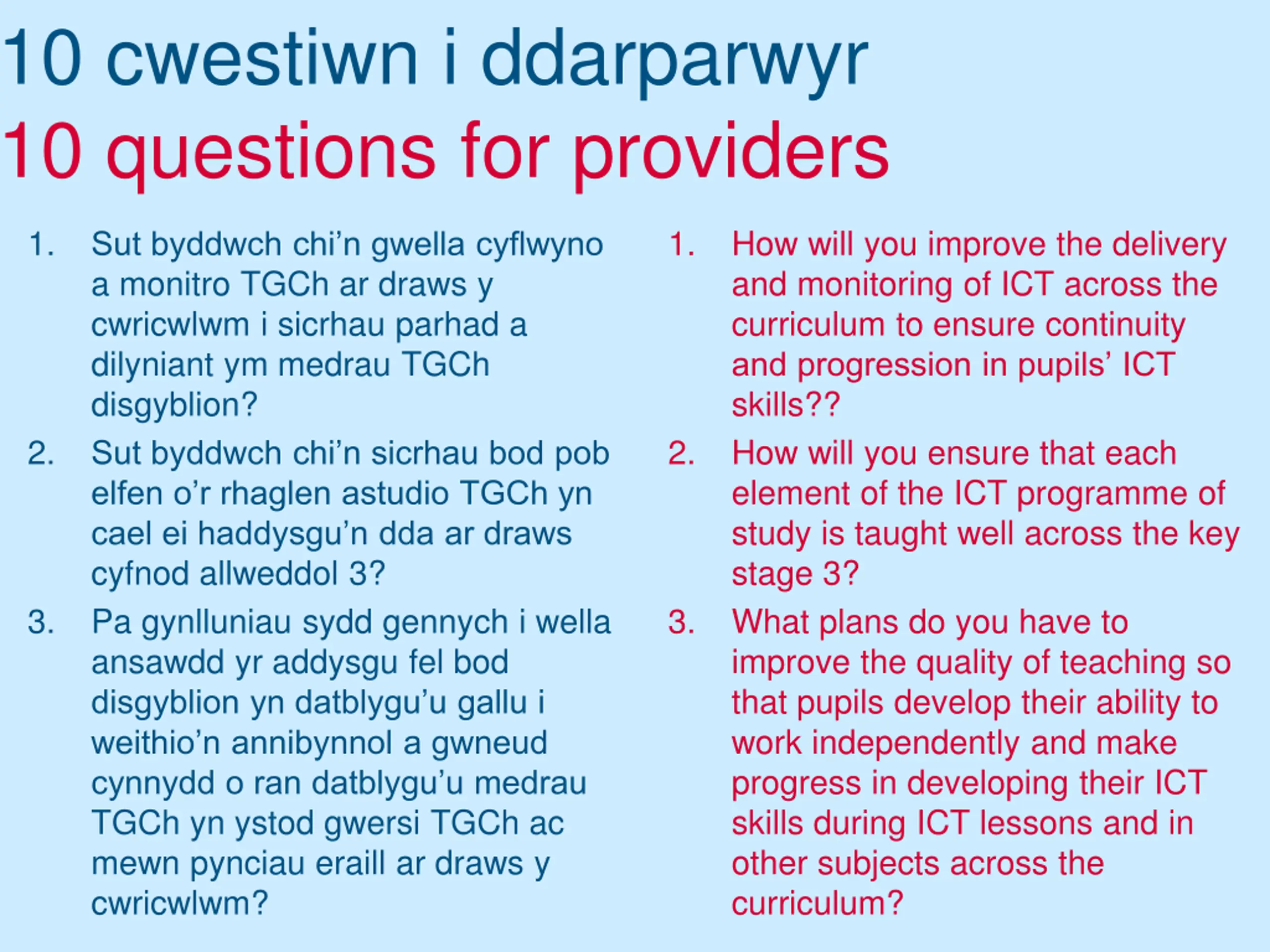 10 cwestiwn i ddarparwyr 10 questions for providers 1. 1. How will you improve the delivery and monitoring of ICT across the curriculum to ensure continuity and progression in pupils ICT skills?? How will you ensure that each element of the ICT programme of study is taught well across the key stage 3? What plans do you have to improve the quality of teaching so that pupils develop their ability to work independently and make progress in developing their ICT skills during ICT lessons and in other subjects across the curriculum? Sut byddwch chi n gwella cyflwyno a monitro TGCh ar draws y cwricwlwm i sicrhau parhad a dilyniant ym medrau TGCh disgyblion? Sut byddwch chi n sicrhau bod pob elfen o r rhaglen astudio TGCh yn cael ei haddysgu n dda ar draws cyfnod allweddol 3? Pa gynlluniau sydd gennych i wella ansawdd yr addysgu fel bod disgyblion yn datblygu u gallu i weithio n annibynnol a gwneud cynnydd o ran datblygu u medrau TGCh yn ystod gwersi TGCh ac mewn pynciau eraill ar draws y cwricwlwm? 2. 2. 3. 3.