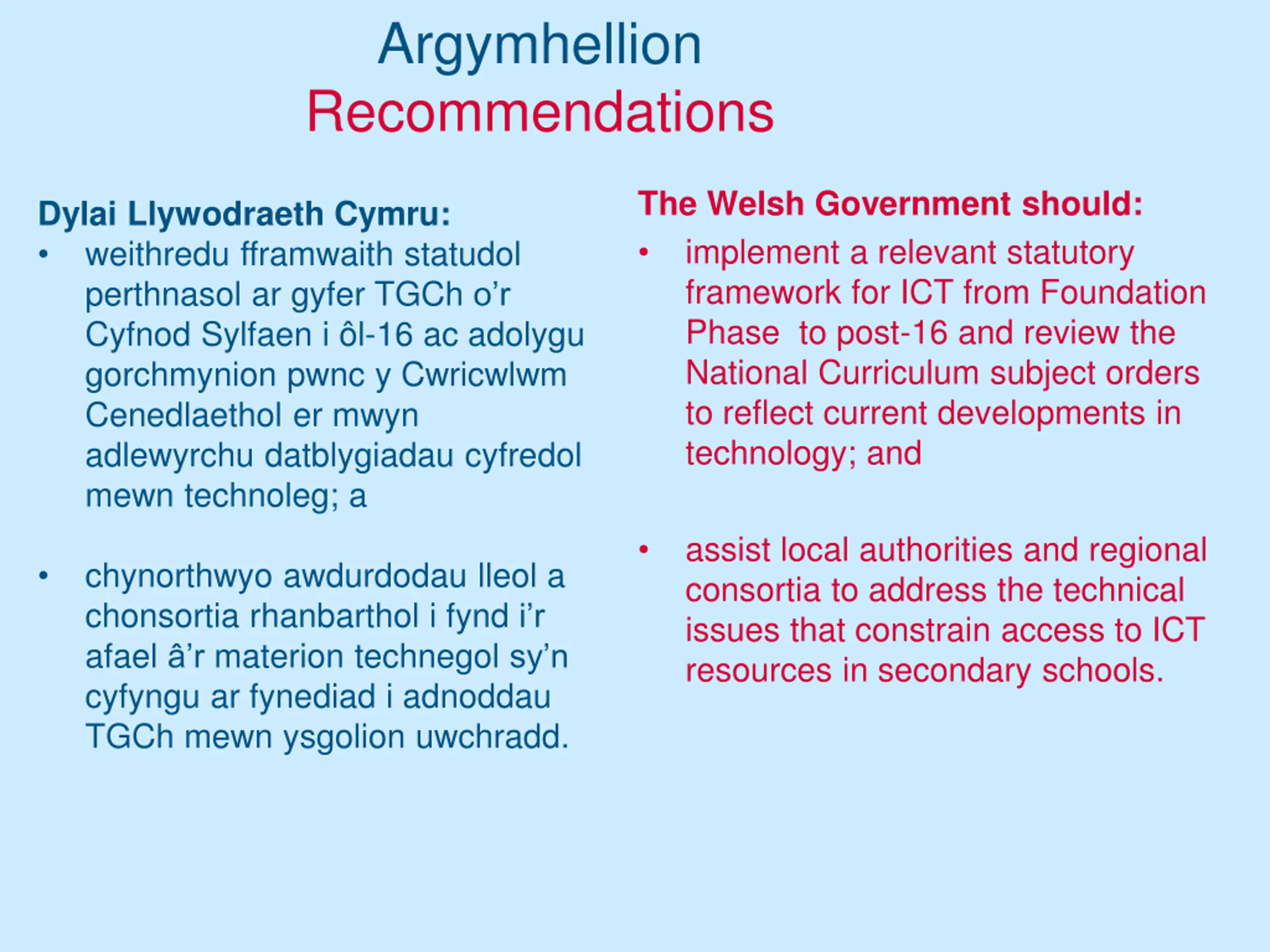 Argymhellion Recommendations The Welsh Government should: implement a relevant statutory framework for ICT from Foundation Phase to post-16 and review the National Curriculum subject orders to reflect current developments in technology; and Dylai Llywodraeth Cymru: weithredu fframwaith statudol perthnasol ar gyfer TGCh o r Cyfnod Sylfaen i l-16 ac adolygu gorchmynion pwnc y Cwricwlwm Cenedlaethol er mwyn adlewyrchu datblygiadau cyfredol mewn technoleg; a assist local authorities and regional consortia to address the technical issues that constrain access to ICT resources in secondary schools. chynorthwyo awdurdodau lleol a chonsortia rhanbarthol i fynd i r afael r materion technegol sy n cyfyngu ar fynediad i adnoddau TGCh mewn ysgolion uwchradd.