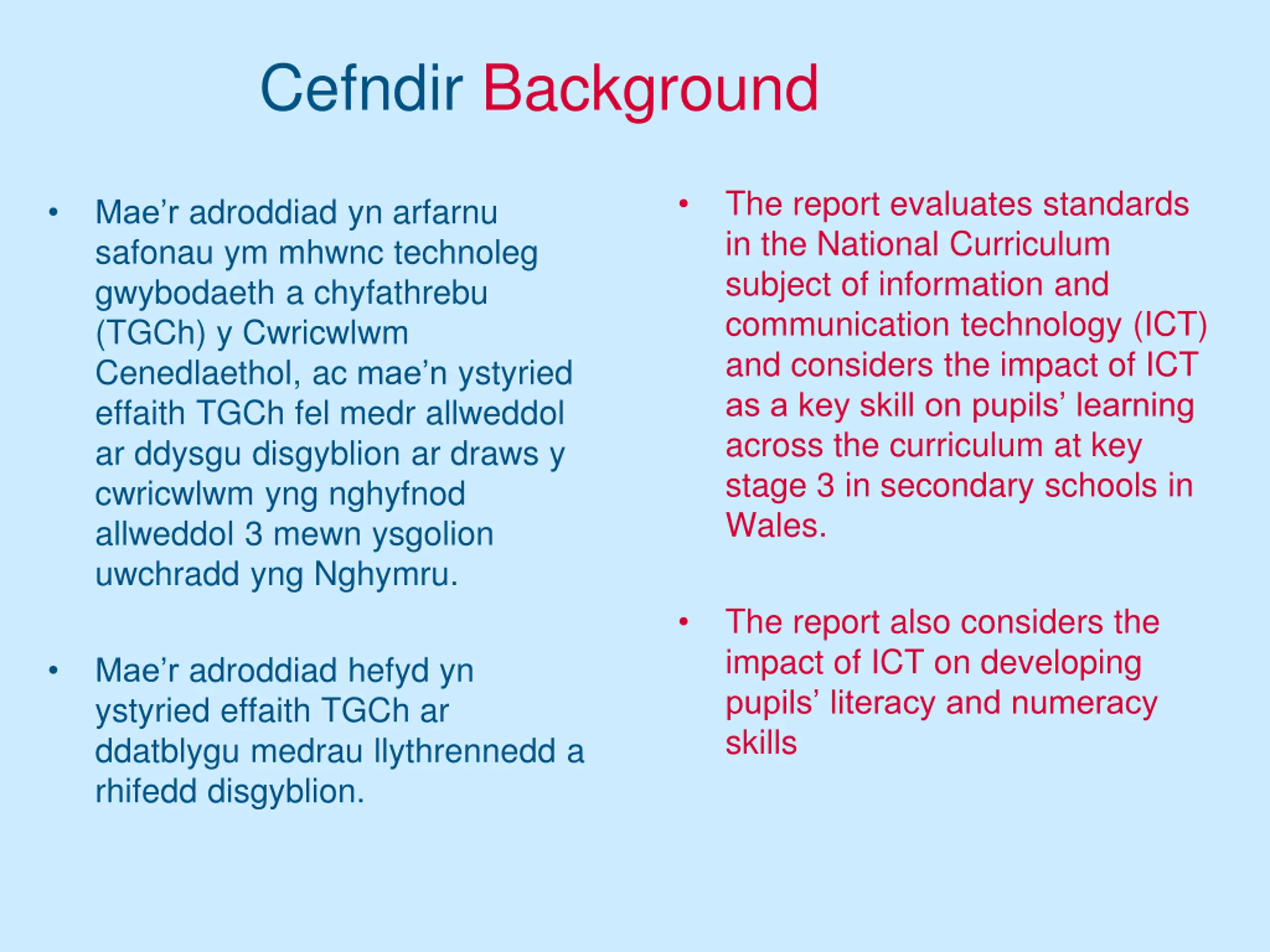 Cefndir Background The report evaluates standards in the National Curriculum subject of information and communication technology (ICT) and considers the impact of ICT as a key skill on pupils learning across the curriculum at key stage 3 in secondary schools in Wales. Mae r adroddiad yn arfarnu safonau ym mhwnc technoleg gwybodaeth a chyfathrebu (TGCh) y Cwricwlwm Cenedlaethol, ac mae n ystyried effaith TGCh fel medr allweddol ar ddysgu disgyblion ar draws y cwricwlwm yng nghyfnod allweddol 3 mewn ysgolion uwchradd yng Nghymru. The report also considers the impact of ICT on developing pupils literacy and numeracy skills Mae r adroddiad hefyd yn ystyried effaith TGCh ar ddatblygu medrau llythrennedd a rhifedd disgyblion.