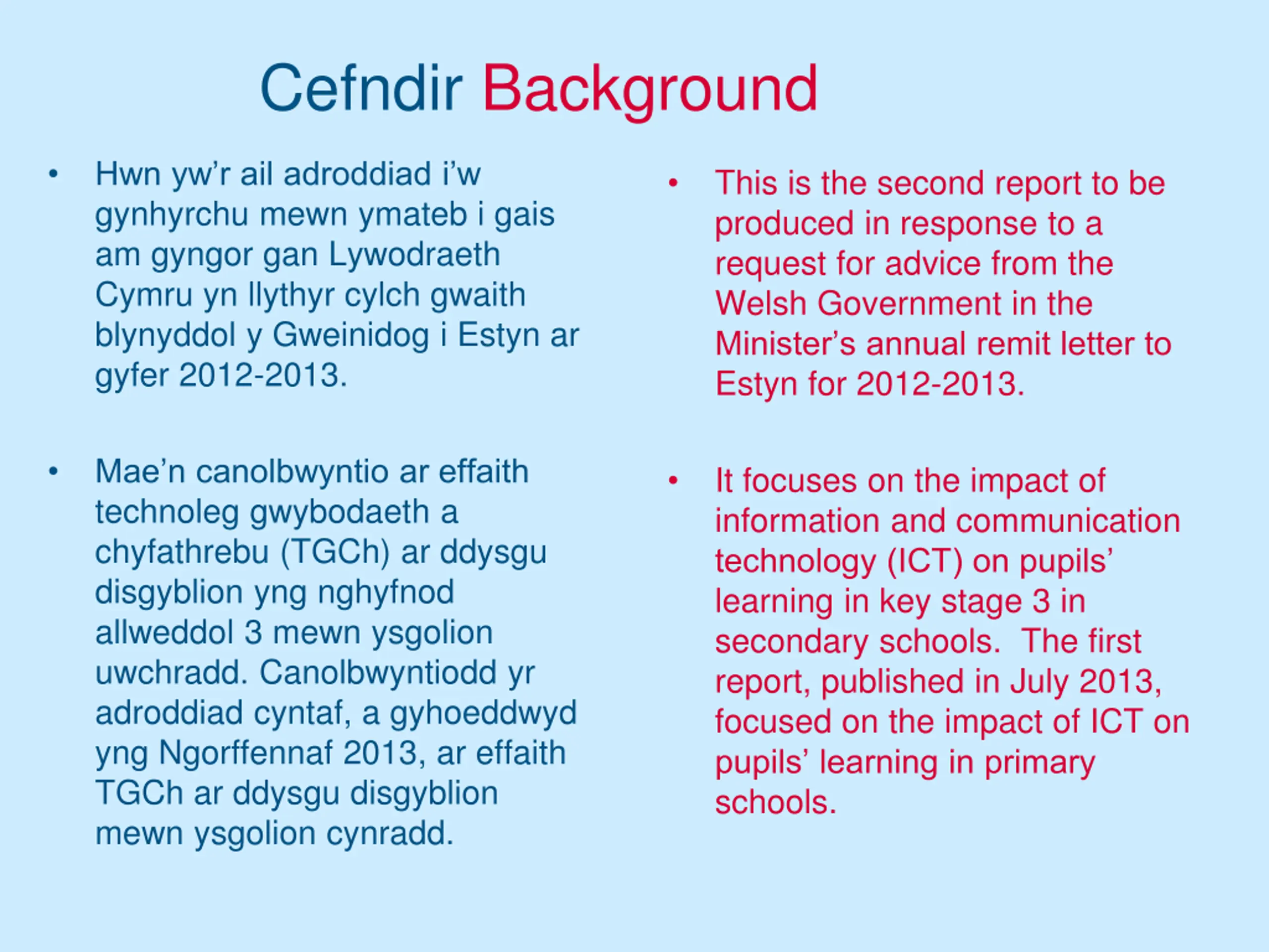 Cefndir Background Hwn yw r ail adroddiad i w gynhyrchu mewn ymateb i gais am gyngor gan Lywodraeth Cymru yn llythyr cylch gwaith blynyddol y Gweinidog i Estyn ar gyfer 2012-2013. This is the second report to be produced in response to a request for advice from the Welsh Government in the Minister s annual remit letter to Estyn for 2012-2013. Mae n canolbwyntio ar effaith technoleg gwybodaeth a chyfathrebu (TGCh) ar ddysgu disgyblion yng nghyfnod allweddol 3 mewn ysgolion uwchradd. Canolbwyntiodd yr adroddiad cyntaf, a gyhoeddwyd yng Ngorffennaf 2013, ar effaith TGCh ar ddysgu disgyblion mewn ysgolion cynradd. It focuses on the impact of information and communication technology (ICT) on pupils learning in key stage 3 in secondary schools. The first report, published in July 2013, focused on the impact of ICT on pupils learning in primary schools.