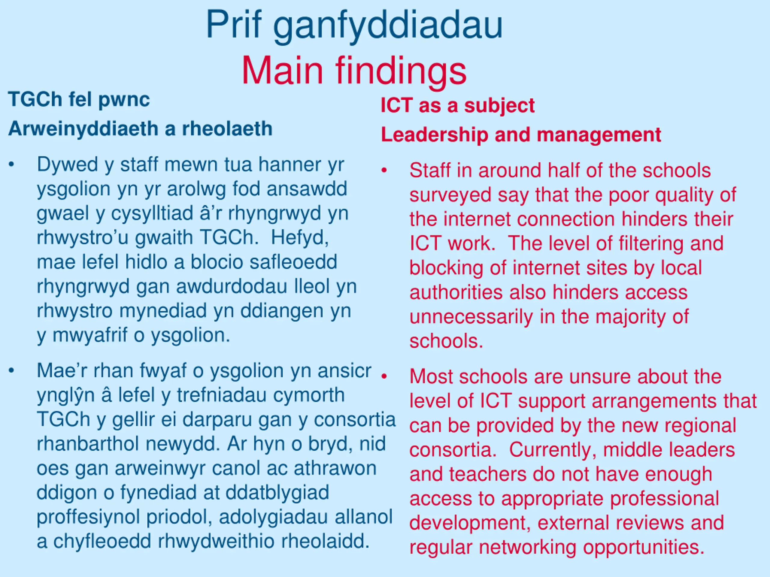 Prif ganfyddiadau Main findings TGCh fel pwnc Arweinyddiaeth a rheolaeth ICT as a subject Leadership and management Dywed y staff mewn tua hanner yr ysgolion yn yr arolwg fod ansawdd gwael y cysylltiad r rhyngrwyd yn rhwystro u gwaith TGCh. Hefyd, mae lefel hidlo a blocio safleoedd rhyngrwyd gan awdurdodau lleol yn rhwystro mynediad yn ddiangen yn y mwyafrif o ysgolion. Staff in around half of the schools surveyed say that the poor quality of the internet connection hinders their ICT work. The level of filtering and blocking of internet sites by local authorities also hinders access unnecessarily in the majority of schools. Mae r rhan fwyaf o ysgolion yn ansicr yngl n lefel y trefniadau cymorth TGCh y gellir ei darparu gan y consortia rhanbarthol newydd. Ar hyn o bryd, nid oes gan arweinwyr canol ac athrawon ddigon o fynediad at ddatblygiad proffesiynol priodol, adolygiadau allanol a chyfleoedd rhwydweithio rheolaidd. Most schools are unsure about the level of ICT support arrangements that can be provided by the new regional consortia. Currently, middle leaders and teachers do not have enough access to appropriate professional development, external reviews and regular networking opportunities.