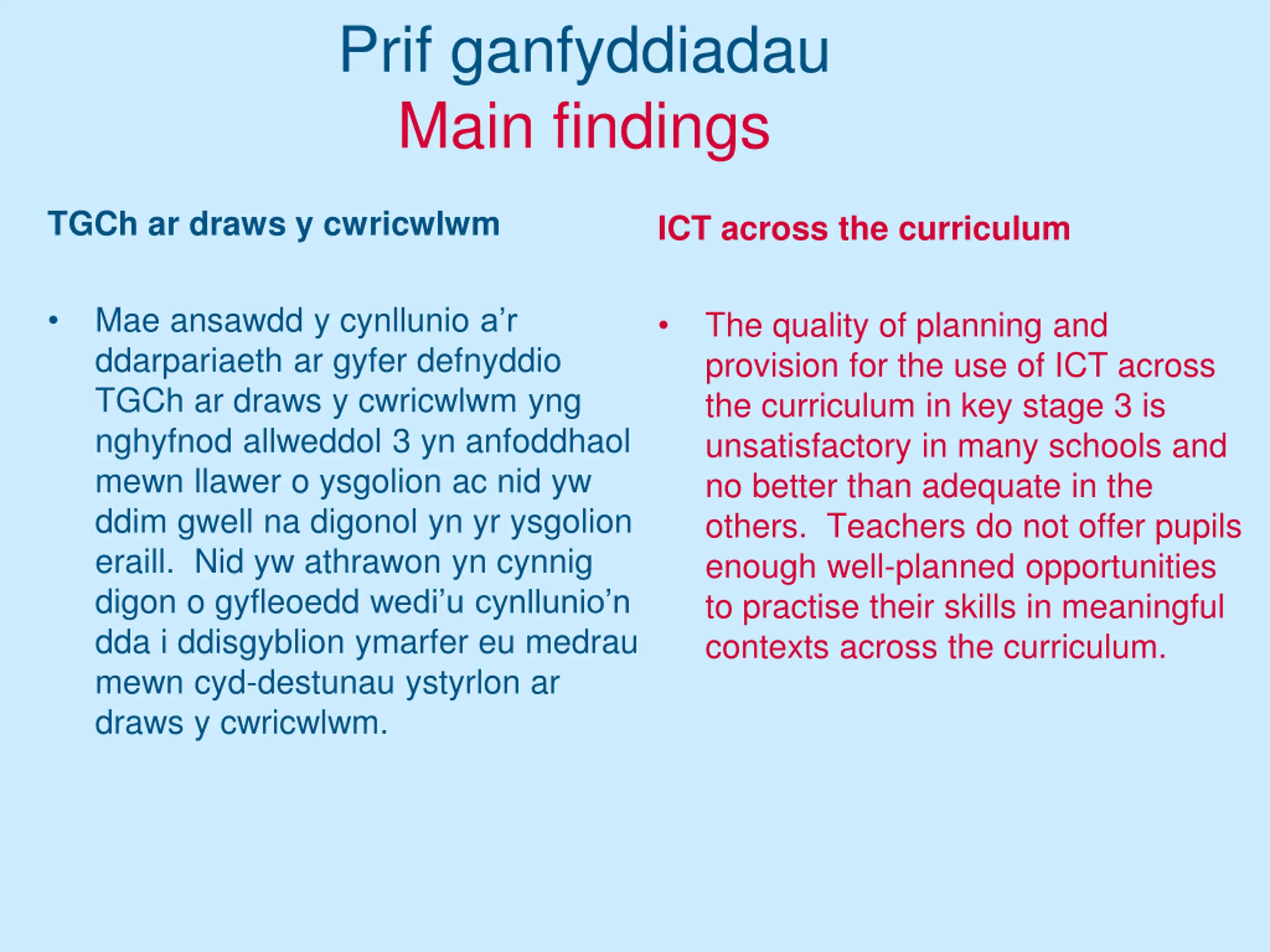 Prif ganfyddiadau Main findings TGCh ar draws y cwricwlwm ICT across the curriculum Mae ansawdd y cynllunio a r ddarpariaeth ar gyfer defnyddio TGCh ar draws y cwricwlwm yng nghyfnod allweddol 3 yn anfoddhaol mewn llawer o ysgolion ac nid yw ddim gwell na digonol yn yr ysgolion eraill. Nid yw athrawon yn cynnig digon o gyfleoedd wedi ucynllunio n dda i ddisgyblion ymarfer eu medrau mewn cyd-destunau ystyrlon ar draws y cwricwlwm. The quality of planning and provision for the use of ICT across the curriculum in key stage 3 is unsatisfactory in many schools and no better than adequate in the others. Teachers do not offer pupils enough well-planned opportunities to practise their skills in meaningful contexts across the curriculum.