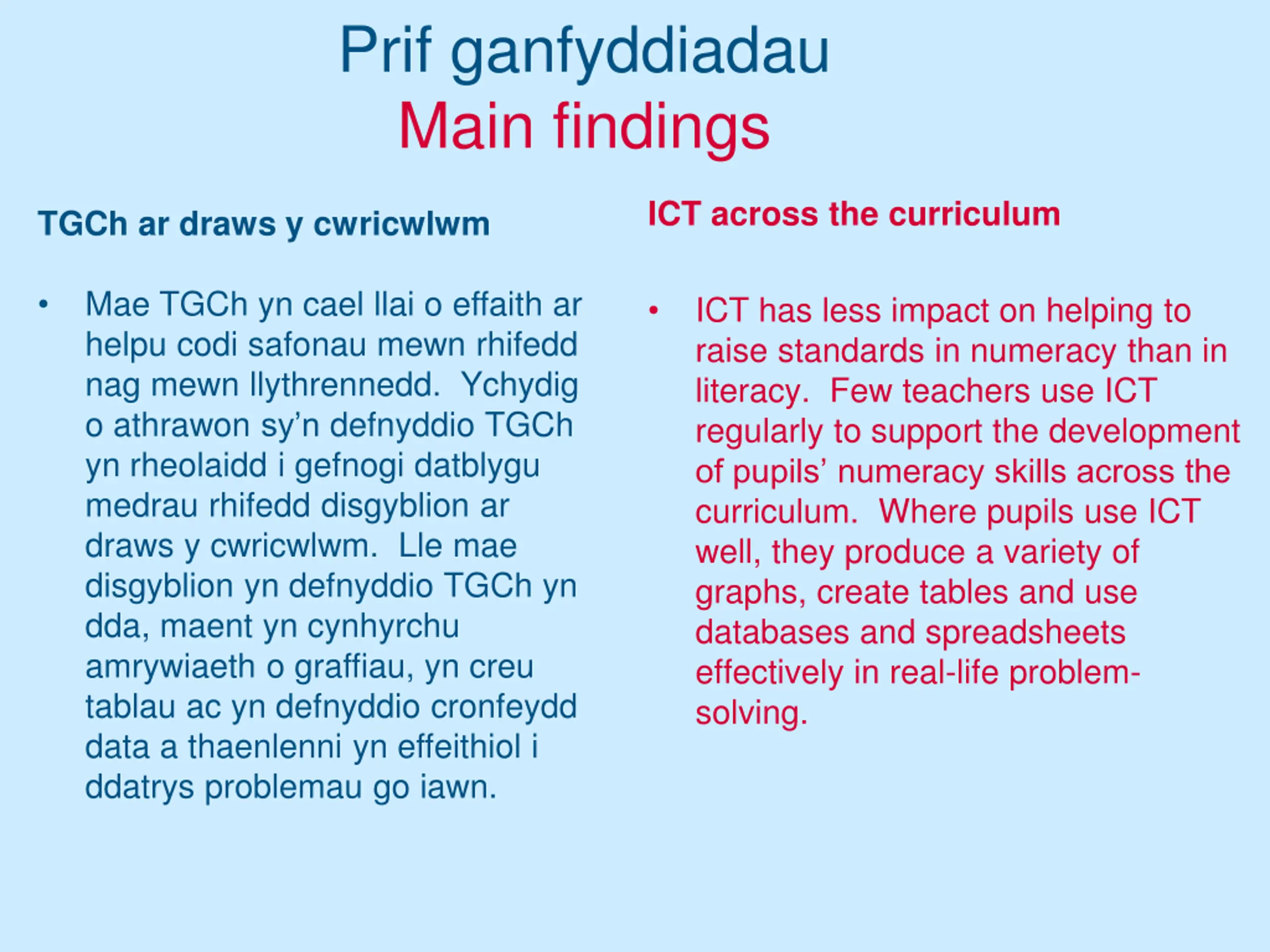 Prif ganfyddiadau Main findings ICT across the curriculum TGCh ar draws y cwricwlwm Mae TGCh yn cael llai o effaith ar helpu codi safonau mewn rhifedd nag mewn llythrennedd. Ychydig o athrawon sy n defnyddio TGCh yn rheolaidd i gefnogi datblygu medrau rhifedd disgyblion ar draws y cwricwlwm. Lle mae disgyblion yn defnyddio TGCh yn dda, maent yn cynhyrchu amrywiaeth o graffiau, yn creu tablau ac yn defnyddio cronfeydd data a thaenlenni yn effeithiol i ddatrys problemau go iawn. ICT has less impact on helping to raise standards in numeracy than in literacy. Few teachers use ICT regularly to support the development of pupils numeracy skills across the curriculum. Where pupils use ICT well, they produce a variety of graphs, create tables and use databases and spreadsheets effectively in real-life problem- solving.