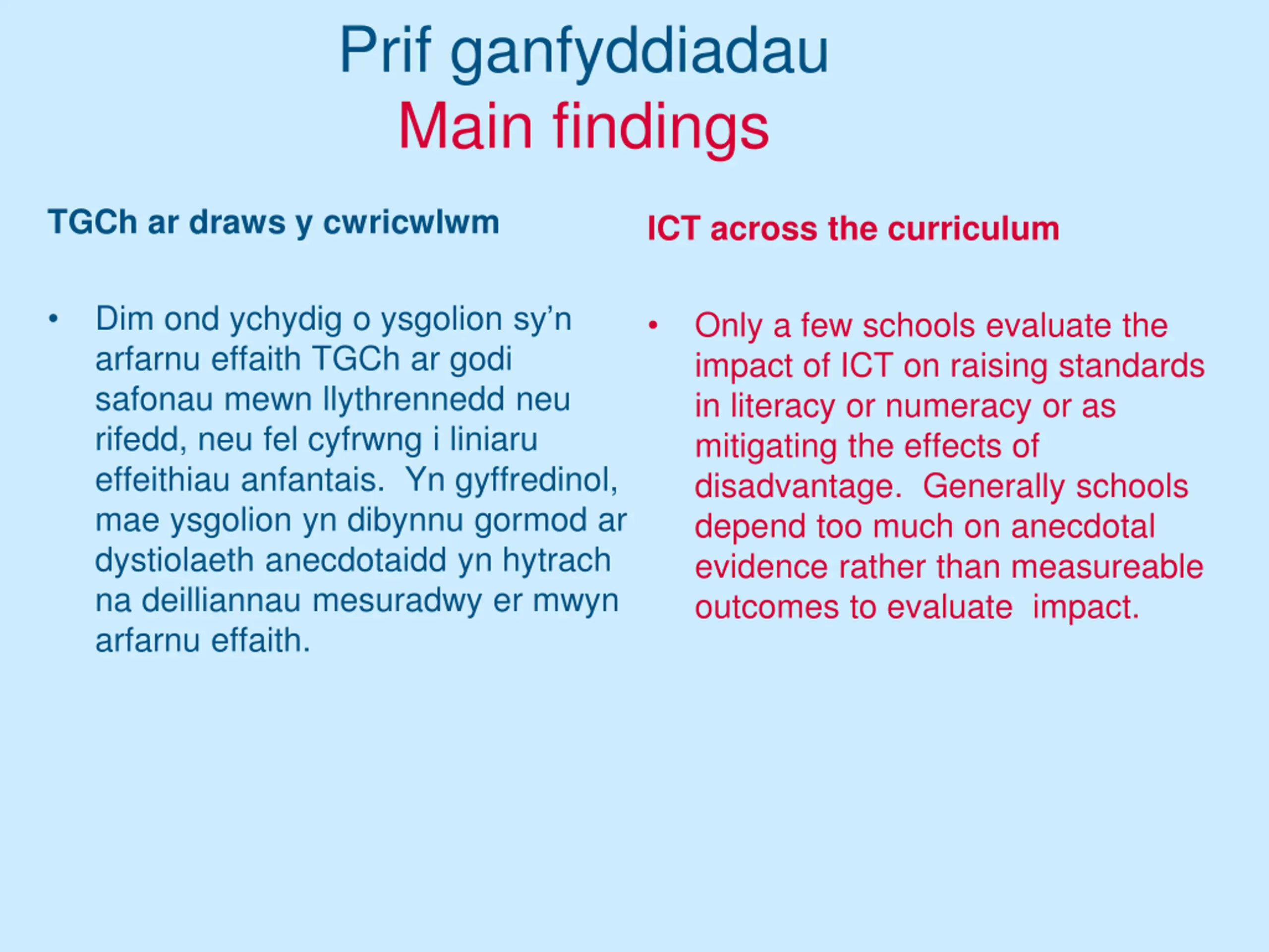 Prif ganfyddiadau Main findings TGCh ar draws y cwricwlwm ICT across the curriculum Dim ond ychydig o ysgolion sy n arfarnu effaith TGCh ar godi safonau mewn llythrennedd neu rifedd, neu fel cyfrwng i liniaru effeithiau anfantais. Yn gyffredinol, mae ysgolion yn dibynnu gormod ar dystiolaeth anecdotaidd yn hytrach na deilliannau mesuradwy er mwyn arfarnu effaith. Only a few schools evaluate the impact of ICT on raising standards in literacy or numeracy or as mitigating the effects of disadvantage. Generally schools depend too much on anecdotal evidence rather than measureable outcomes to evaluate impact.