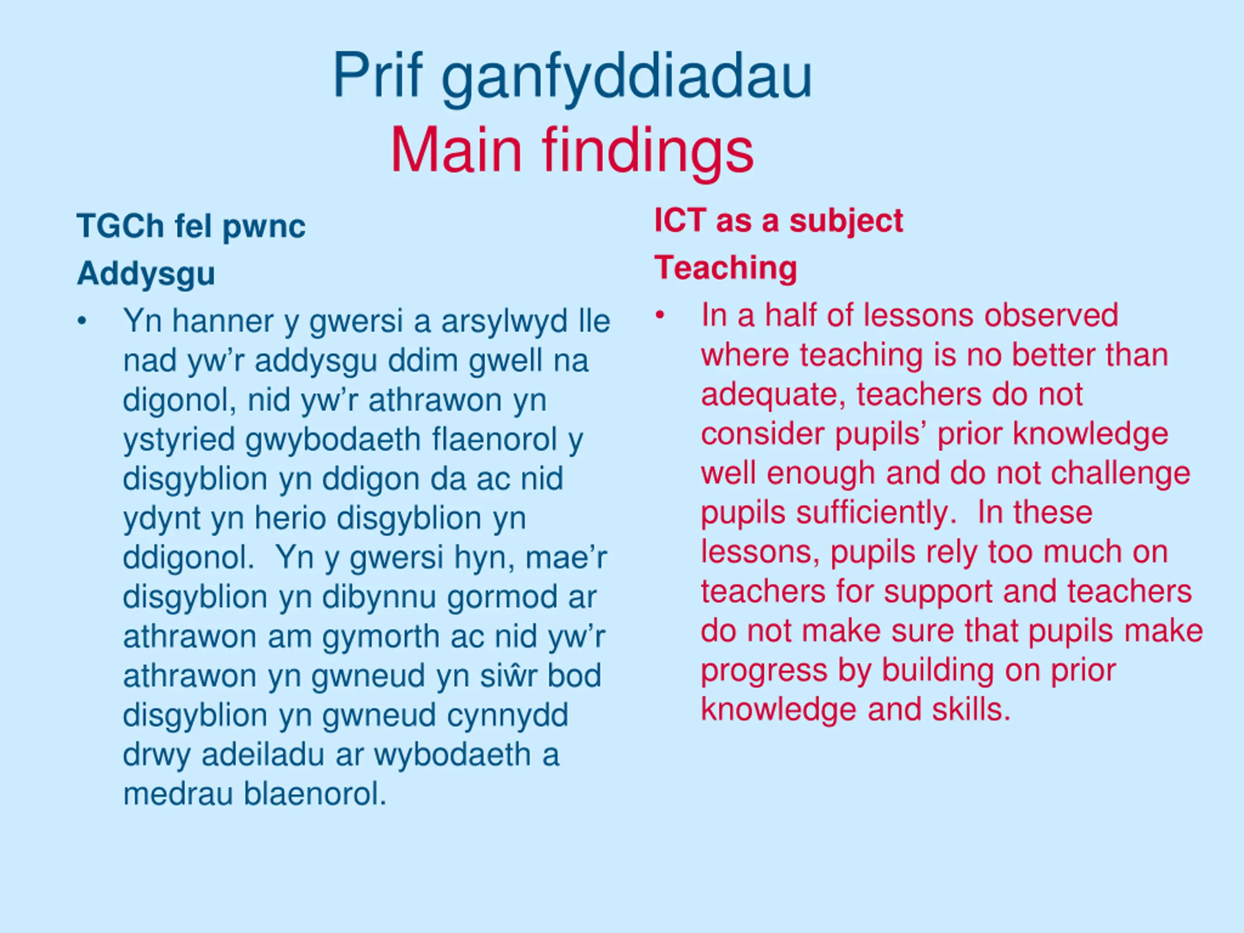 Prif ganfyddiadau Main findings ICT as a subject Teaching In a half of lessons observed where teaching is no better than adequate, teachers do not consider pupils prior knowledge well enough and do not challenge pupils sufficiently. In these lessons, pupils rely too much on teachers for support and teachers do not make sure that pupils make progress by building on prior knowledge and skills. TGCh fel pwnc Addysgu Yn hanner y gwersi a arsylwyd lle nad yw r addysgu ddim gwell na digonol, nid yw r athrawon yn ystyried gwybodaeth flaenorol y disgyblion yn ddigon da ac nid ydynt yn herio disgyblion yn ddigonol. Yn y gwersi hyn, mae r disgyblion yn dibynnu gormod ar athrawon am gymorth ac nid yw r athrawon yn gwneud yn si r bod disgyblion yn gwneud cynnydd drwy adeiladu ar wybodaeth a medrau blaenorol.