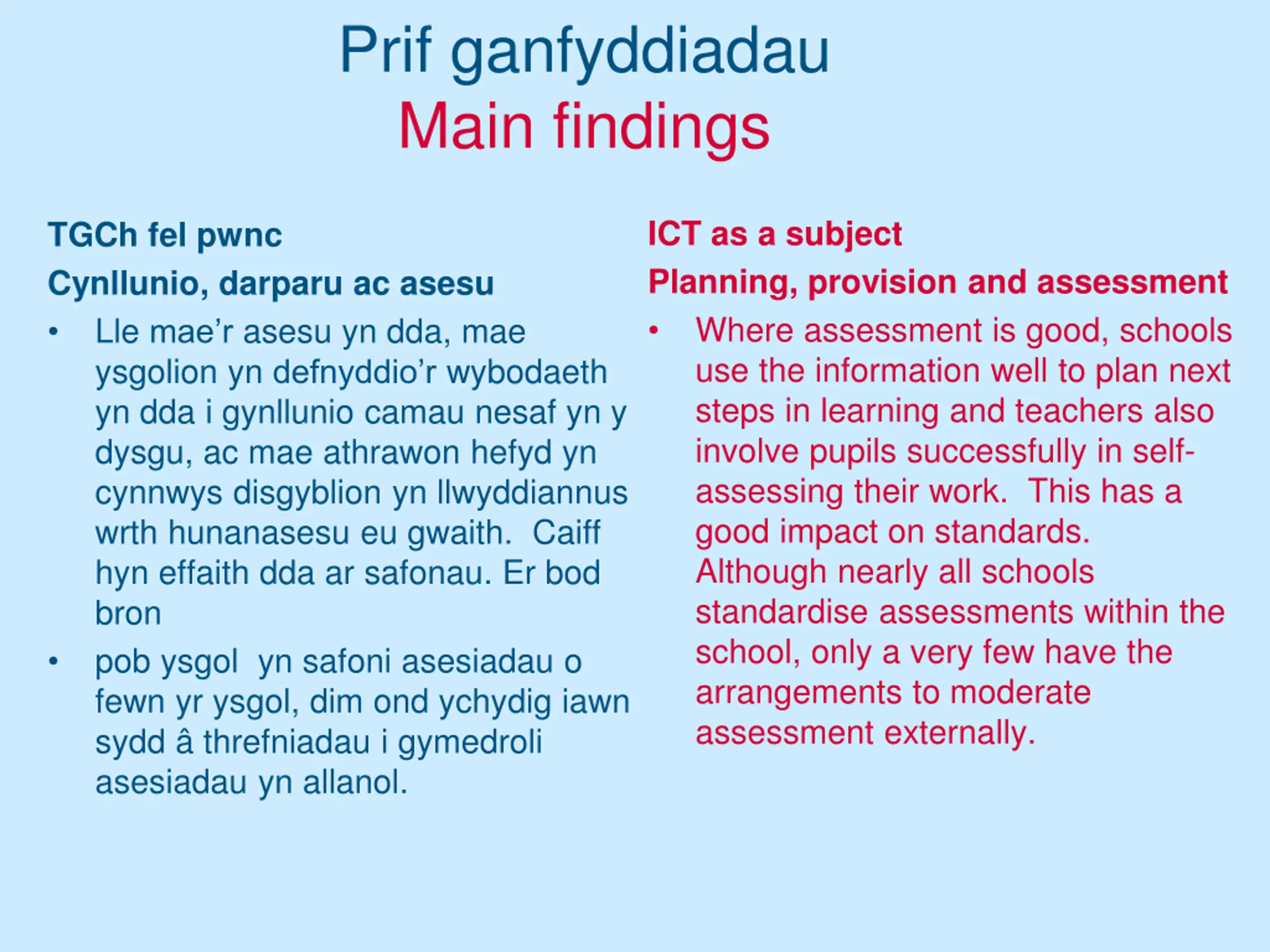 Prif ganfyddiadau Main findings ICT as a subject Planning, provision and assessment TGCh fel pwnc Cynllunio, darparu ac asesu Mae amheuaeth ynghylch dibynadwyedd a dilysrwydd asesiadau athrawon mewn TGCh ar ddiwedd cyfnod allweddol 3. Yn aml mae hyn oherwydd bod asesiadau n or-hael, ac ychwanegir at hyn gan ddiffyg dilysu allanol. The reliability and validity of teacher assessment in ICT at the end of key stage 3 are doubtful. This is often due to assessments being overgenerous, compounded by a lack of external verification.