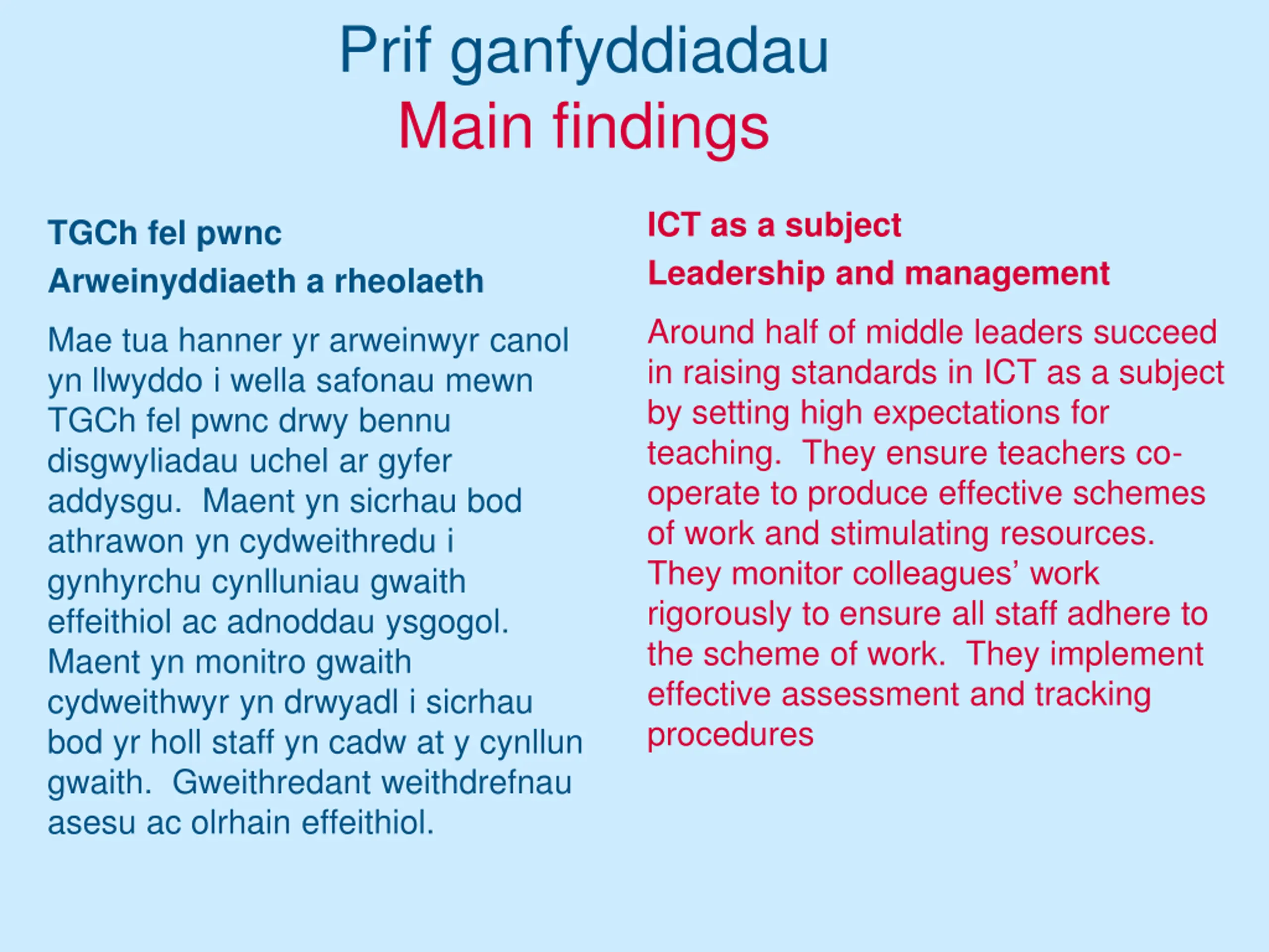 Prif ganfyddiadau Main findings ICT as a subject Leadership and management TGCh fel pwnc Arweinyddiaeth a rheolaeth Around half of middle leaders succeed in raising standards in ICT as a subject by setting high expectations for teaching. They ensure teachers co- operate to produce effective schemes of work and stimulating resources. They monitor colleagues work rigorously to ensure all staff adhere to the scheme of work. They implement effective assessment and tracking procedures Mae tua hanner yr arweinwyr canol yn llwyddo i wella safonau mewn TGCh fel pwnc drwy bennu disgwyliadau uchel ar gyfer addysgu. Maent yn sicrhau bod athrawon yn cydweithredu i gynhyrchu cynlluniau gwaith effeithiol ac adnoddau ysgogol. Maent yn monitro gwaith cydweithwyr yn drwyadl i sicrhau bod yr holl staff yn cadw at y cynllun gwaith. Gweithredant weithdrefnau asesu ac olrhain effeithiol.