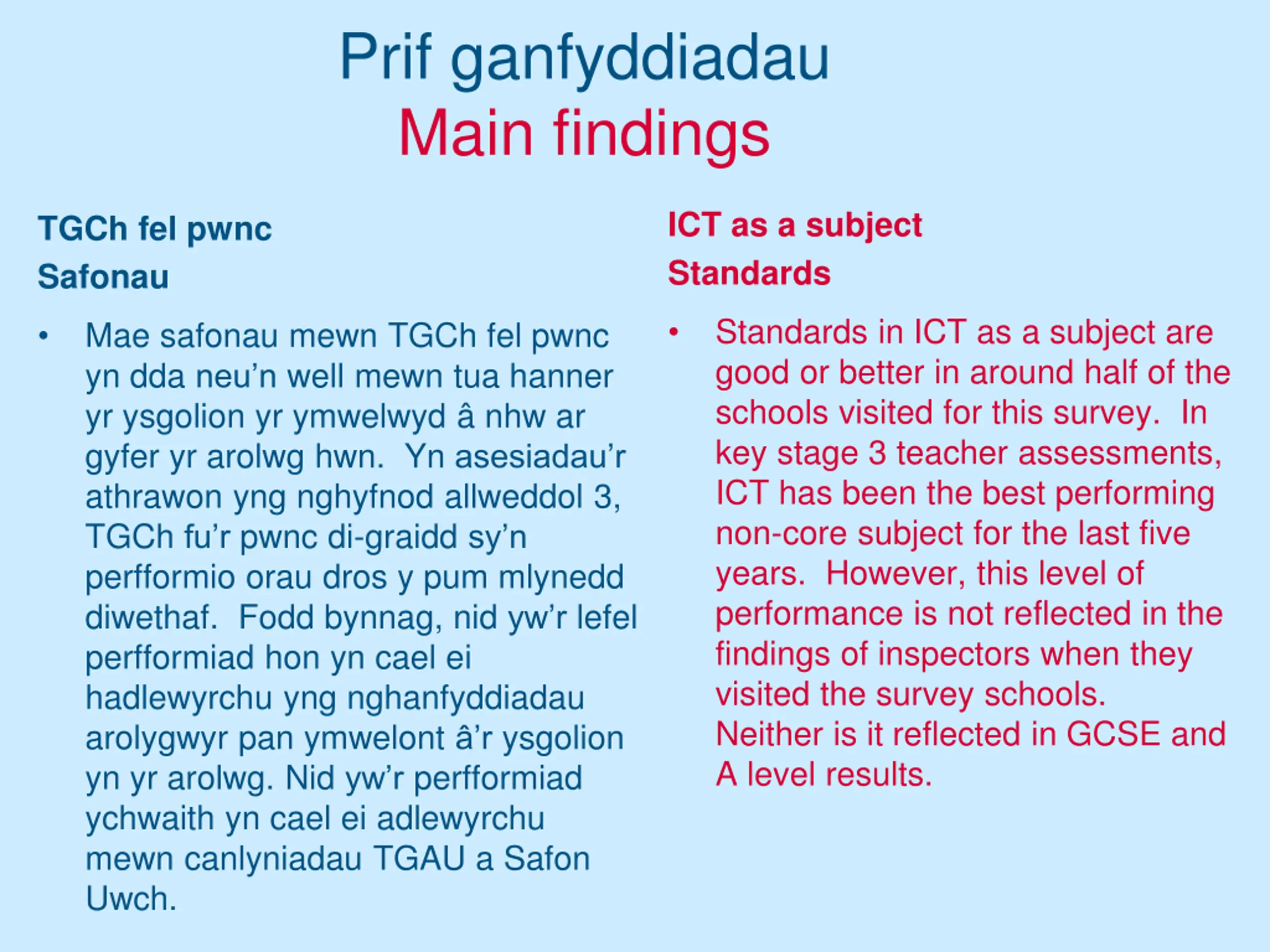 Prif ganfyddiadau Main findings ICT as a subject Standards TGCh fel pwnc Safonau Standards in ICT as a subject are good or better in around half of the schools visited for this survey. In key stage 3 teacher assessments, ICT has been the best performing non-core subject for the last five years. However, this level of performance is not reflected in the findings of inspectors when they visited the survey schools. Neither is it reflected in GCSE and A level results. Mae safonau mewn TGCh fel pwnc yn dda neu n well mewn tua hanner yr ysgolion yr ymwelwyd nhw ar gyfer yr arolwg hwn. Yn asesiadau r athrawon yng nghyfnod allweddol 3, TGCh fu r pwnc di-graidd sy n perfformio orau dros y pum mlynedd diwethaf. Fodd bynnag, nid yw r lefel perfformiad hon yn cael ei hadlewyrchu yng nghanfyddiadau arolygwyr pan ymwelont r ysgolion yn yr arolwg. Nid yw r perfformiad ychwaith yn cael ei adlewyrchu mewn canlyniadau TGAU a Safon Uwch.