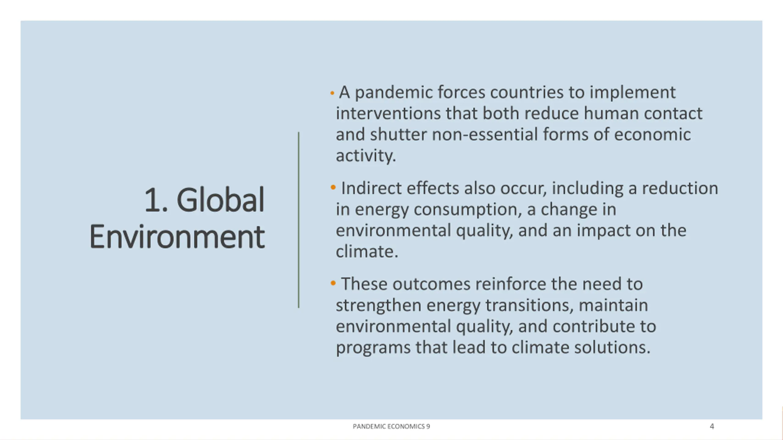 A pandemic forces countries to implement interventions that both reduce human contact and shutter non-essential forms of economic activity. Indirect effects also occur, including a reduction in energy consumption, a change in environmental quality, and an impact on the climate. 1. Global 1. Global Environment Environment These outcomes reinforce the need to strengthen energy transitions, maintain environmental quality, and contribute to programs that lead to climate solutions. 4 PANDEMIC ECONOMICS 9