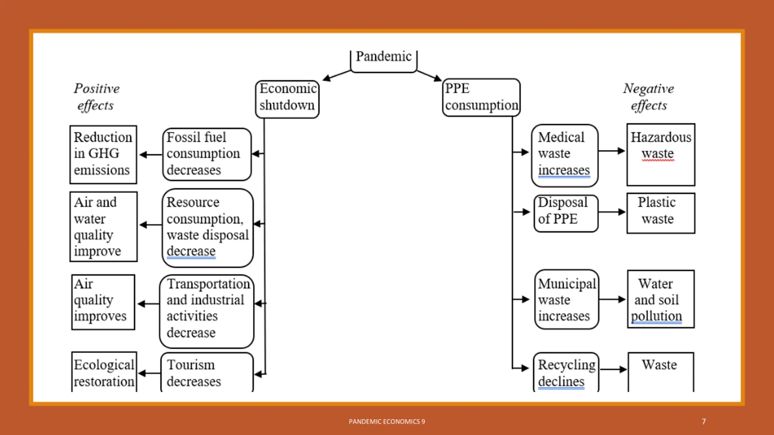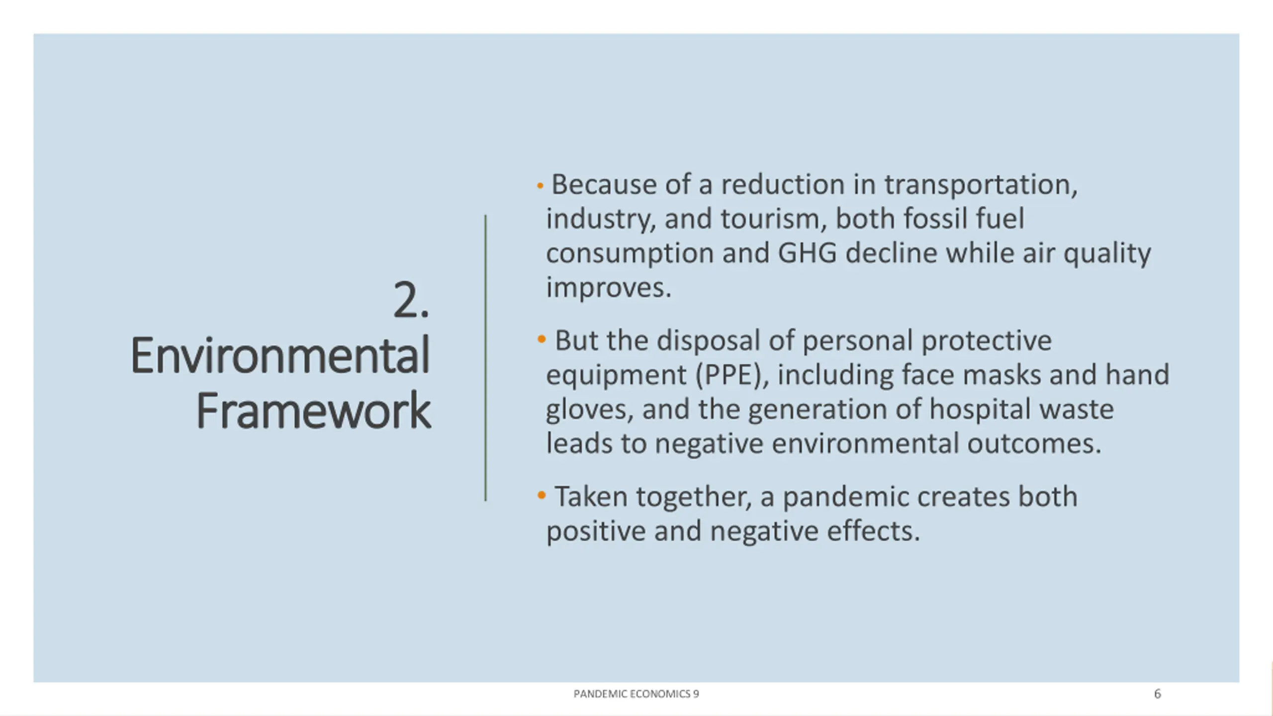 Because of a reduction in transportation, industry, and tourism, both fossil fuel consumption and GHG decline while air quality improves. 2. 2. But the disposal of personal protective equipment (PPE), including face masks and hand gloves, and the generation of hospital waste leads to negative environmental outcomes. Environmental Environmental Framework Framework Taken together, a pandemic creates both positive and negative effects. 6 PANDEMIC ECONOMICS 9