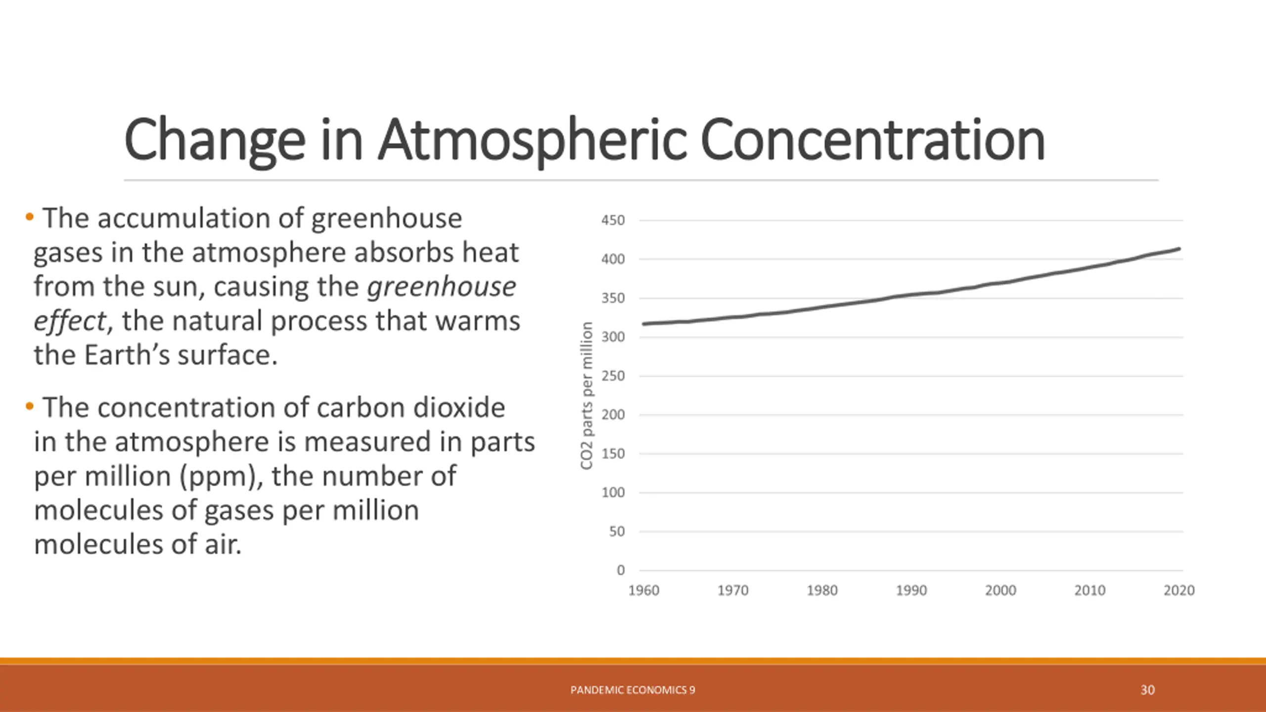 Change in Atmospheric Concentration Change in Atmospheric Concentration The accumulation of greenhouse gases in the atmosphere absorbs heat from the sun, causing the greenhouse effect, the natural process that warms the Earth s surface. The concentration of carbon dioxide in the atmosphere is measured in parts per million (ppm), the number of molecules of gases per million molecules of air. 30 PANDEMIC ECONOMICS 9