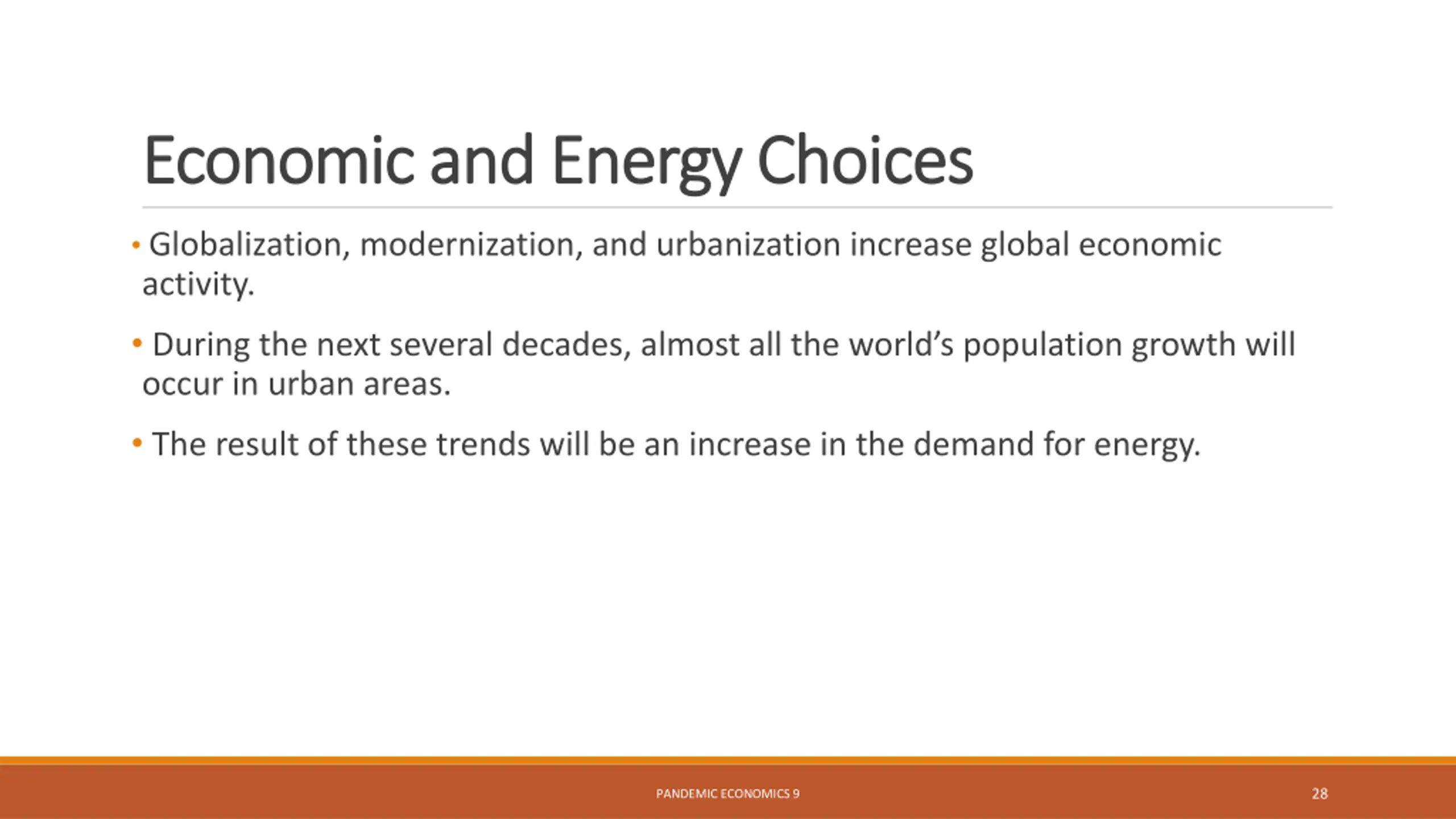 Economic and Energy Choices Economic and Energy Choices Globalization, modernization, and urbanization increase global economic activity. During the next several decades, almost all the world s population growth will occur in urban areas. The result of these trends will be an increase in the demand for energy. 28 PANDEMIC ECONOMICS 9