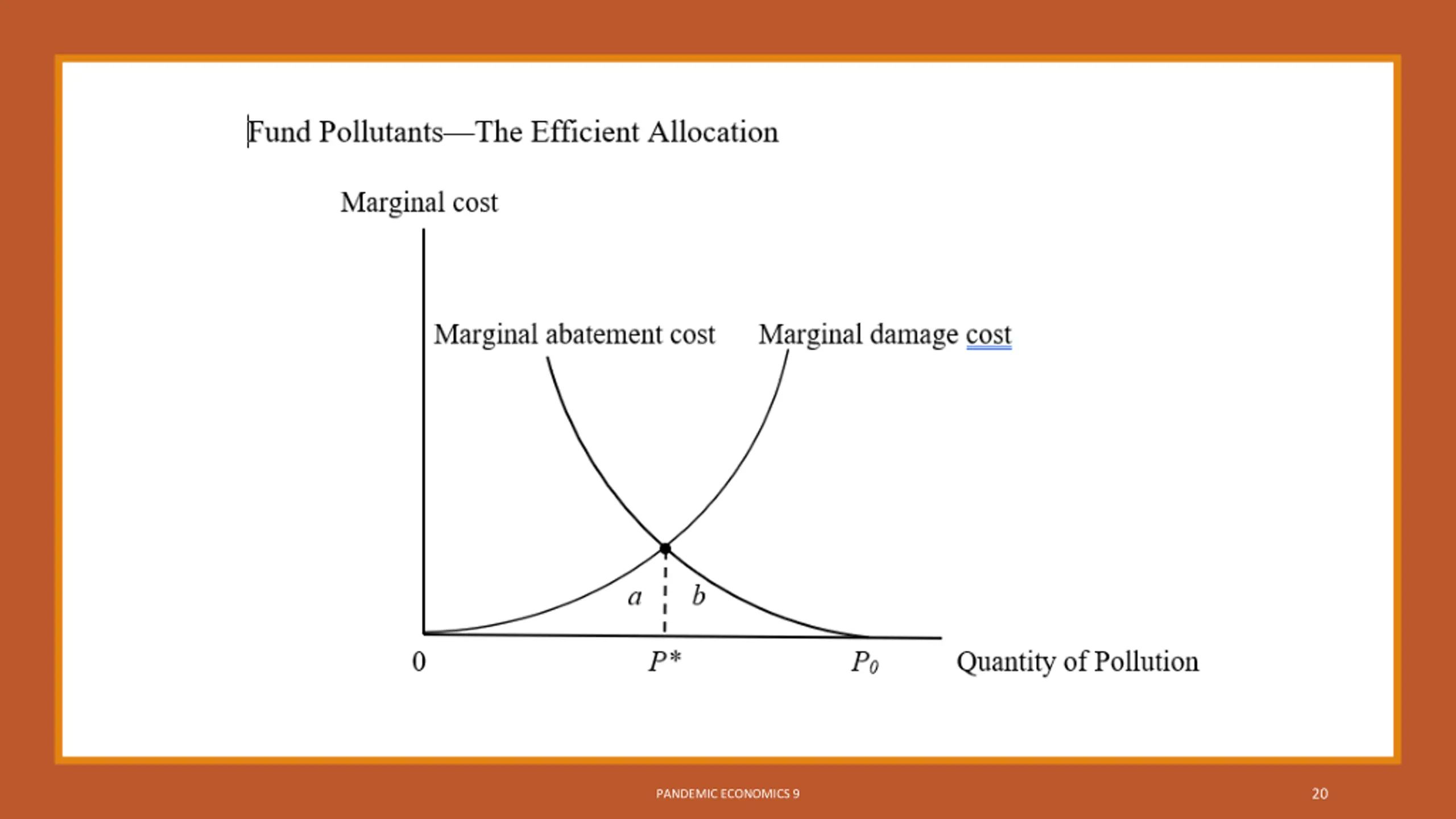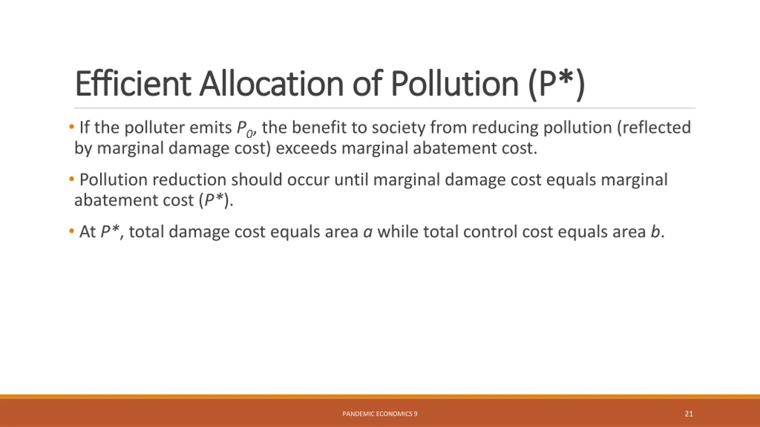 Efficient Allocation of Pollution (P*) Efficient Allocation of Pollution (P*) If the polluter emits P0, the benefit to society from reducing pollution (reflected by marginal damage cost) exceeds marginal abatement cost. Pollution reduction should occur until marginal damage cost equals marginal abatement cost (P*). At P*, total damage cost equals area a while total control cost equals area b. 21 PANDEMIC ECONOMICS 9