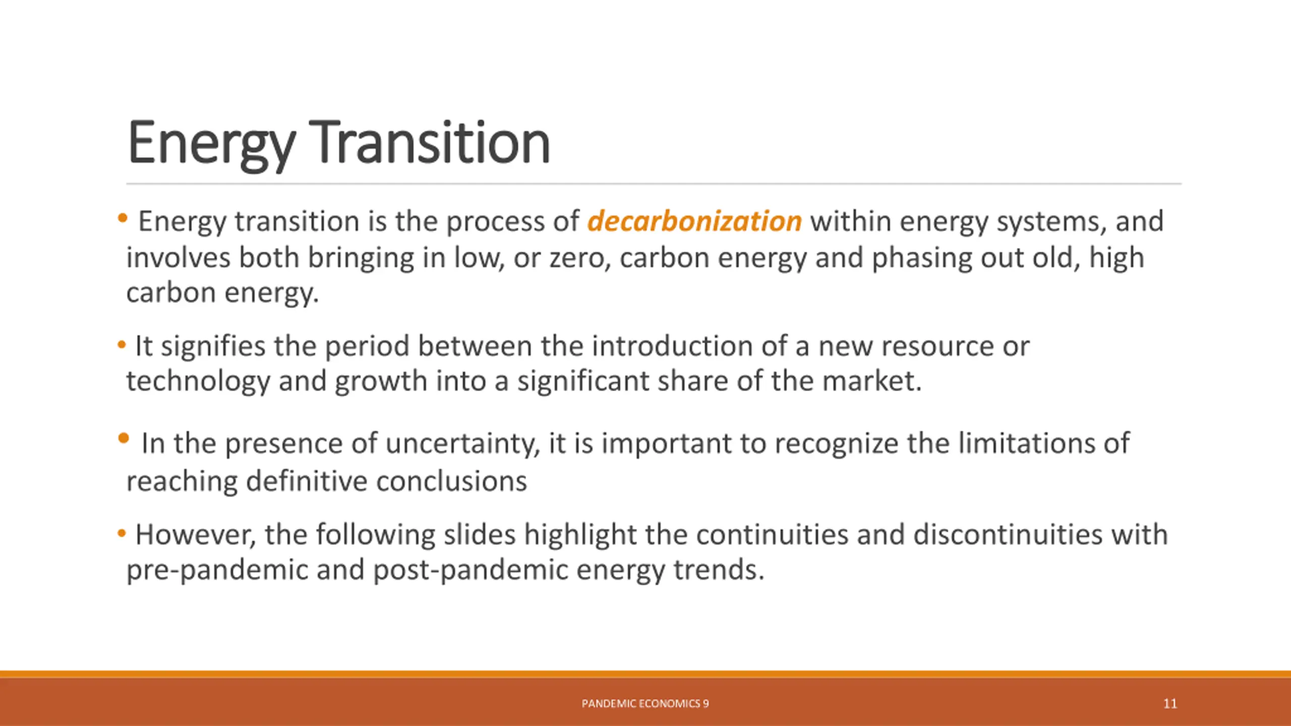 Energy Transition Energy Transition Energy transition is the process of decarbonization within energy systems, and involves both bringing in low, or zero, carbon energy and phasing out old, high carbon energy. It signifies the period between the introduction of a new resource or technology and growth into a significant share of the market. In the presence of uncertainty, it is important to recognize the limitations of reaching definitive conclusions However, the following slides highlight the continuities and discontinuities with pre-pandemic and post-pandemic energy trends. 11 PANDEMIC ECONOMICS 9
