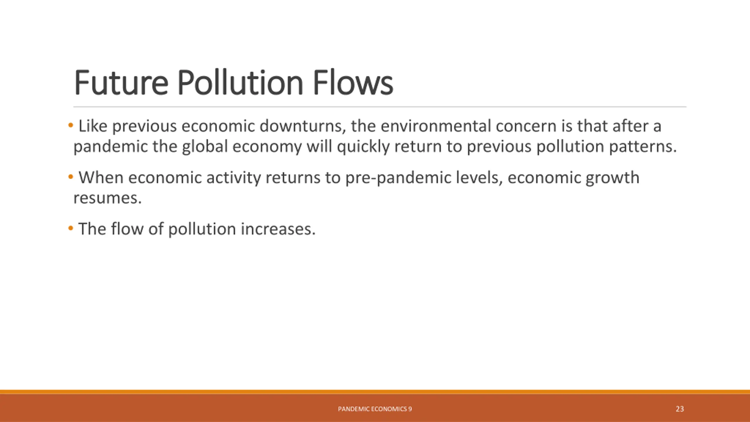 Future Pollution Flows Future Pollution Flows Like previous economic downturns, the environmental concern is that after a pandemic the global economy will quickly return to previous pollution patterns. When economic activity returns to pre-pandemic levels, economic growth resumes. The flow of pollution increases. 23 PANDEMIC ECONOMICS 9