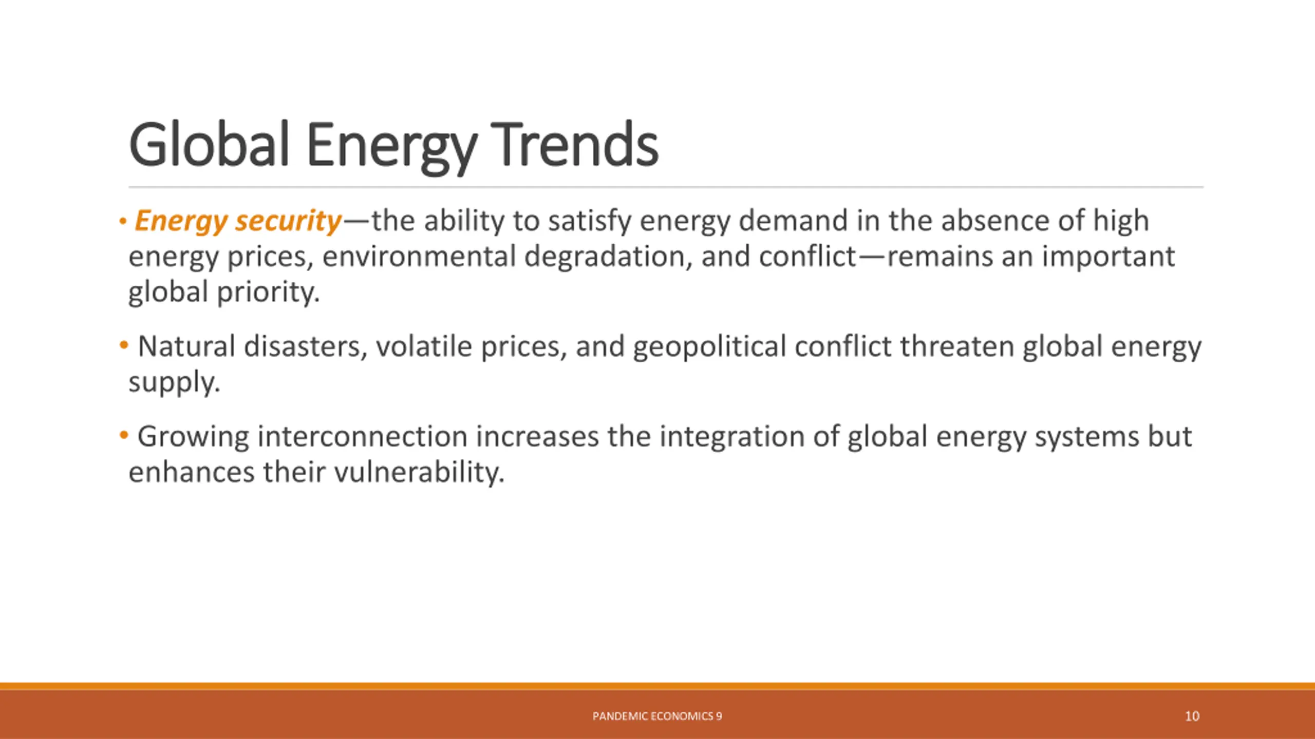 Global Energy Trends Global Energy Trends Energy security the ability to satisfy energy demand in the absence of high energy prices, environmental degradation, and conflict remains an important global priority. Natural disasters, volatile prices, and geopolitical conflict threaten global energy supply. Growing interconnection increases the integration of global energy systems but enhances their vulnerability. 10 PANDEMIC ECONOMICS 9