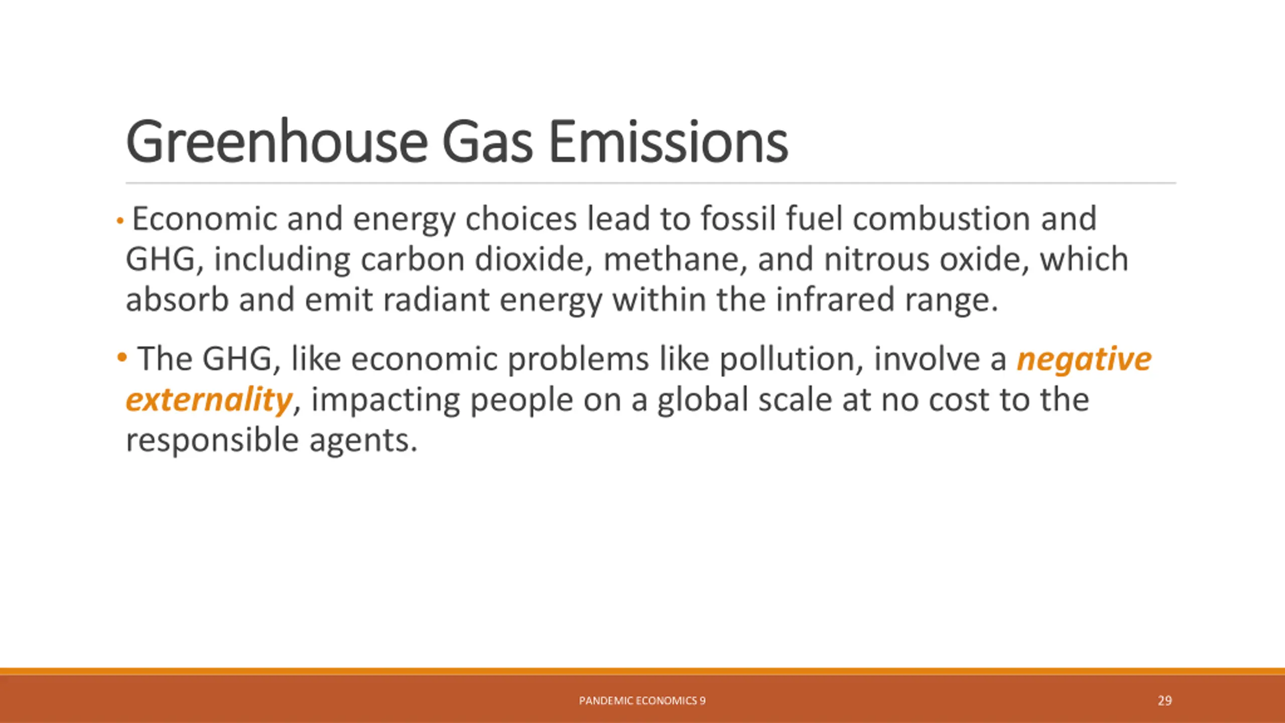Greenhouse Gas Emissions Greenhouse Gas Emissions Economic and energy choices lead to fossil fuel combustion and GHG, including carbon dioxide, methane, and nitrous oxide, which absorb and emit radiant energy within the infrared range. The GHG, like economic problems like pollution, involve a negative externality, impacting people on a global scale at no cost to the responsible agents. 29 PANDEMIC ECONOMICS 9