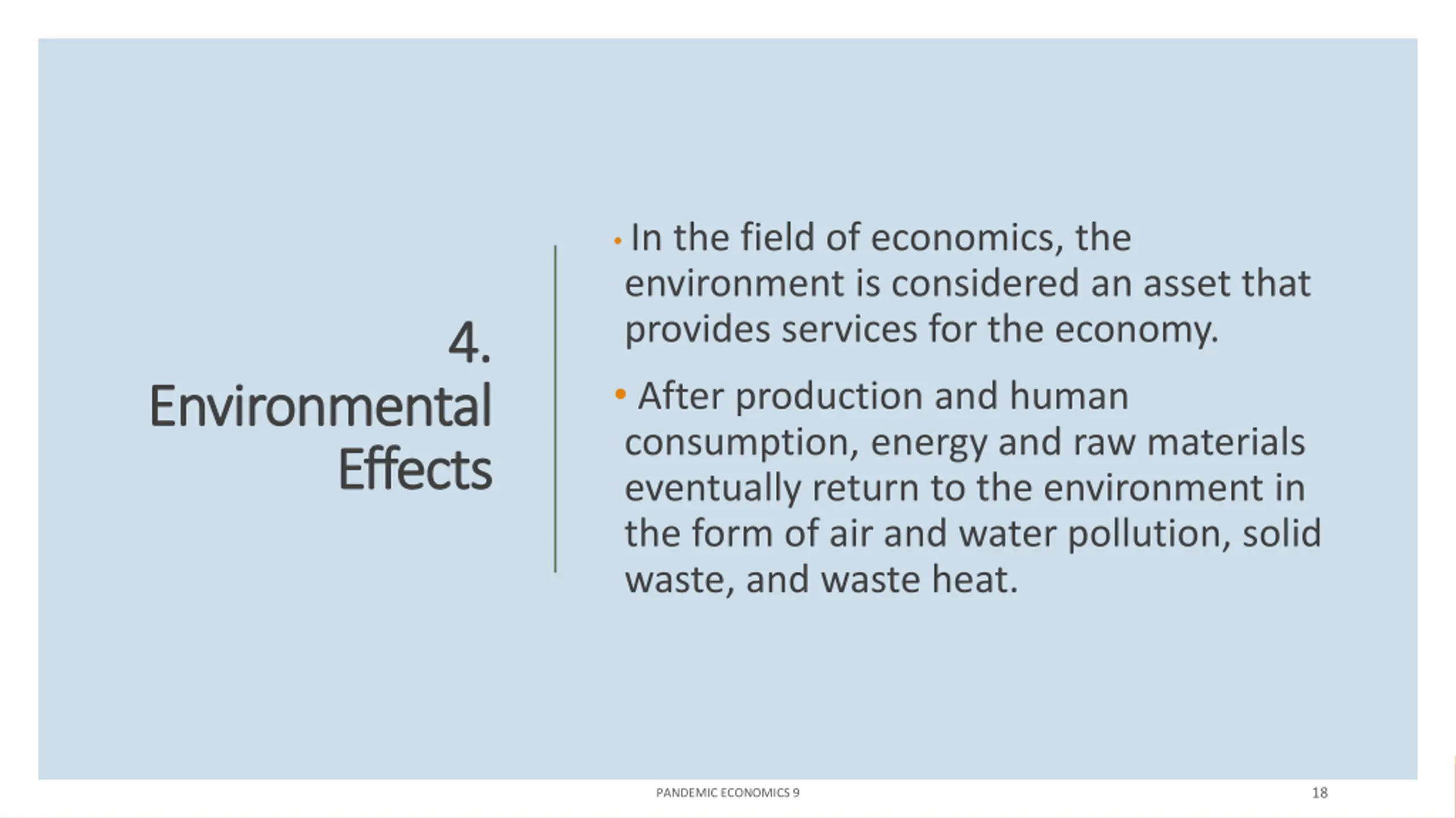 In the field of economics, the environment is considered an asset that provides services for the economy. After production and human consumption, energy and raw materials eventually return to the environment in the form of air and water pollution, solid waste, and waste heat. 4. 4. Environmental Environmental Effects Effects 18 PANDEMIC ECONOMICS 9