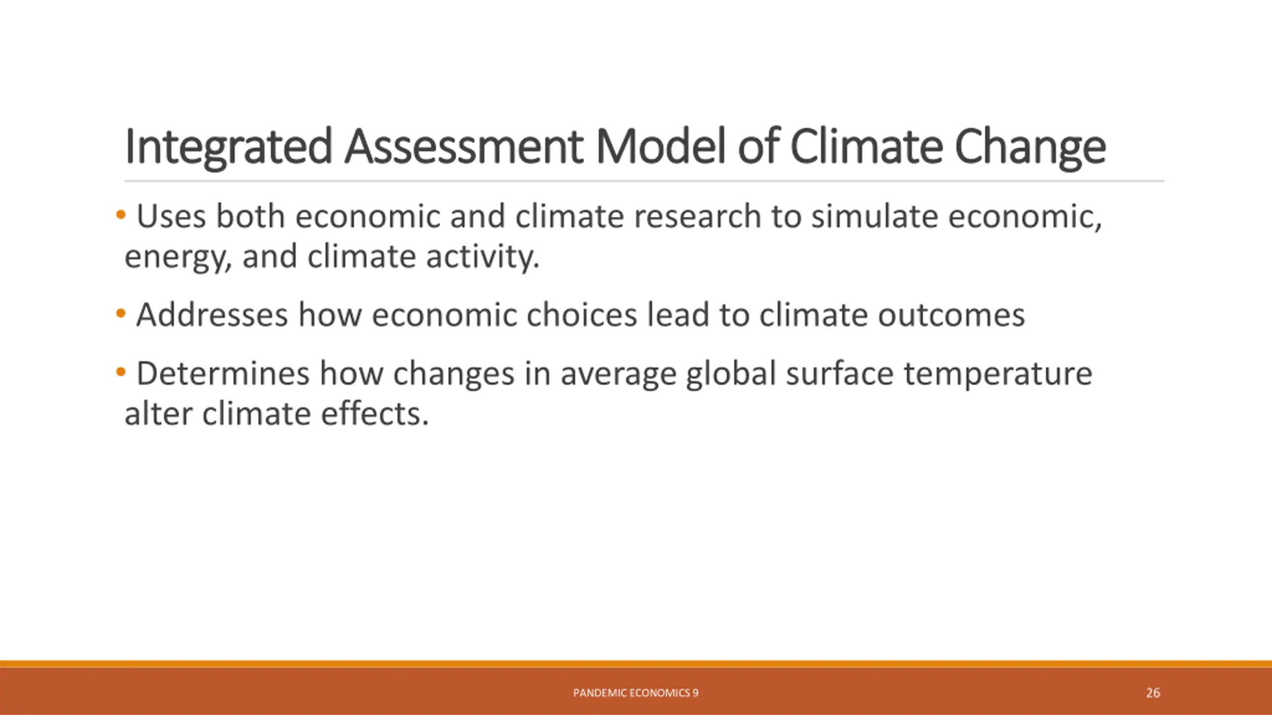 Integrated Assessment Model of Climate Change Integrated Assessment Model of Climate Change Uses both economic and climate research to simulate economic, energy, and climate activity. Addresses how economic choices lead to climate outcomes Determines how changes in average global surface temperature alter climate effects. 26 PANDEMIC ECONOMICS 9