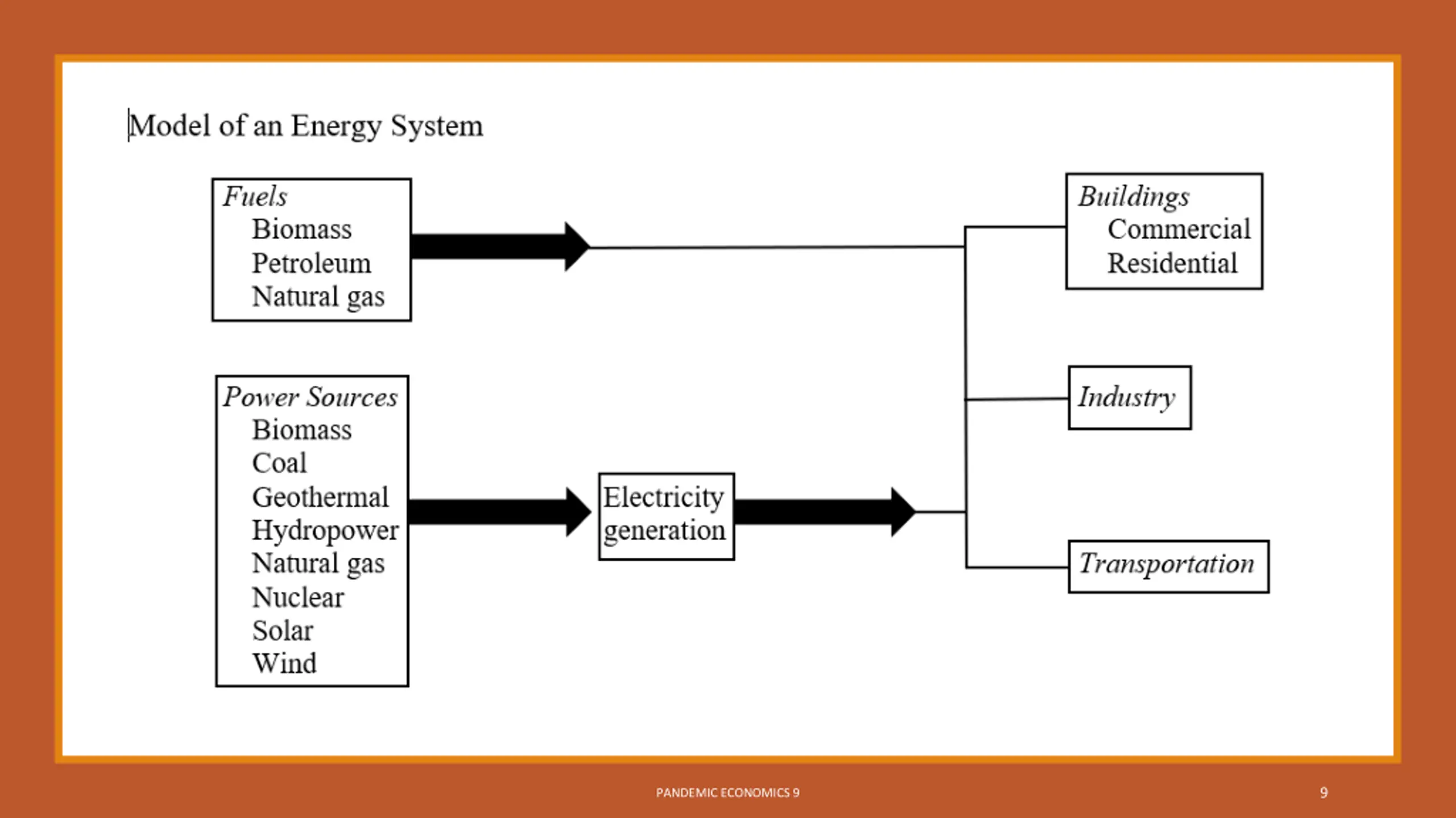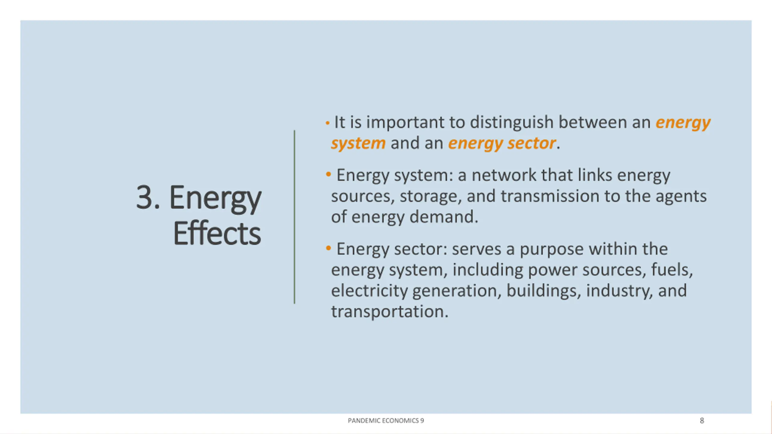 It is important to distinguish between an energy systemand an energy sector. Energy system: a network that links energy sources, storage, and transmission to the agents of energy demand. 3. Energy 3. Energy Effects Effects Energy sector: serves a purpose within the energy system, including power sources, fuels, electricity generation, buildings, industry, and transportation. 8 PANDEMIC ECONOMICS 9