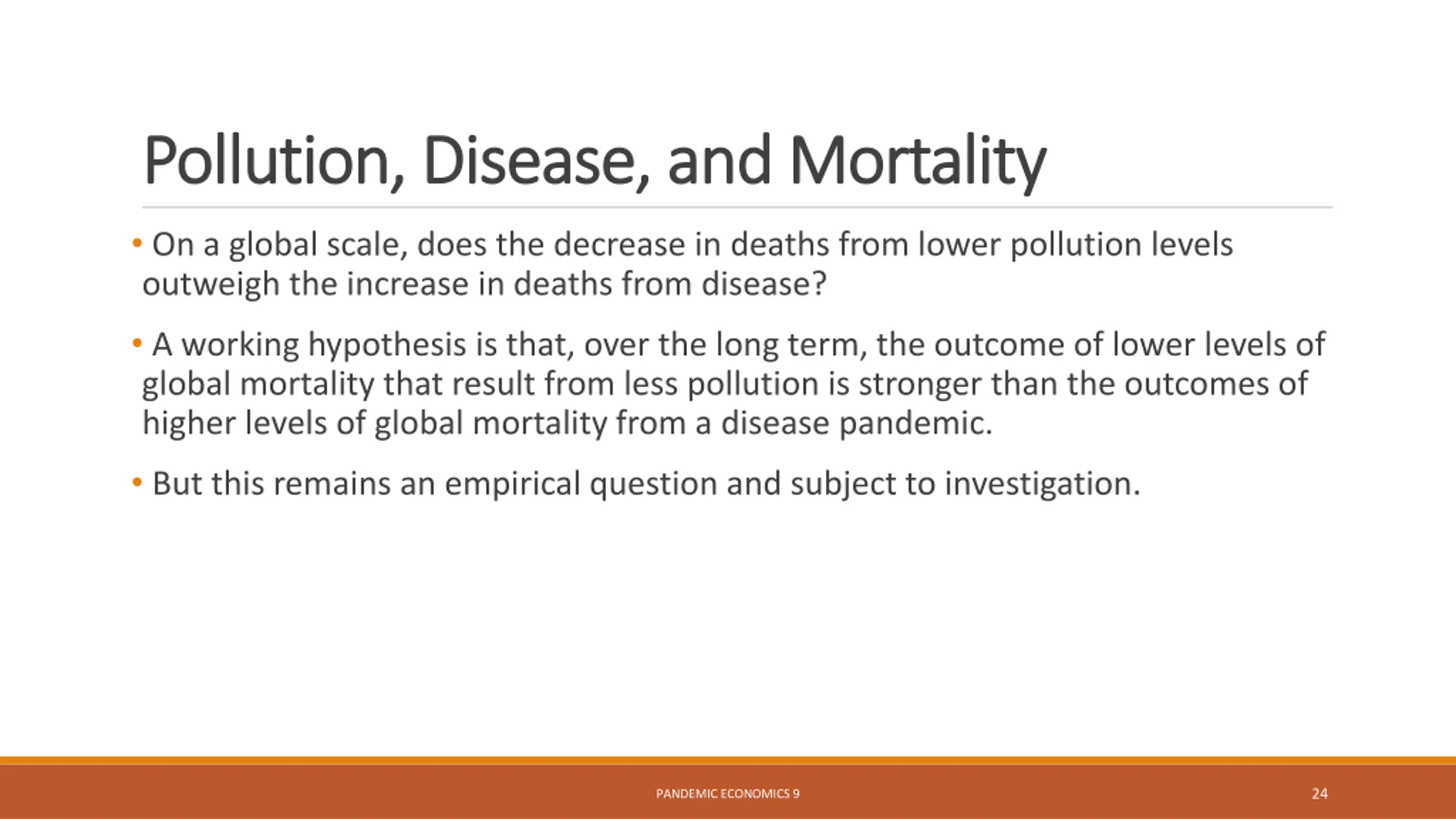 Pollution, Disease, and Mortality Pollution, Disease, and Mortality On a global scale, does the decrease in deaths from lower pollution levels outweigh the increase in deaths from disease? A working hypothesis is that, over the long term, the outcome of lower levels of global mortality that result from less pollution is stronger than the outcomes of higher levels of global mortality from a disease pandemic. But this remains an empirical question and subject to investigation. 24 PANDEMIC ECONOMICS 9
