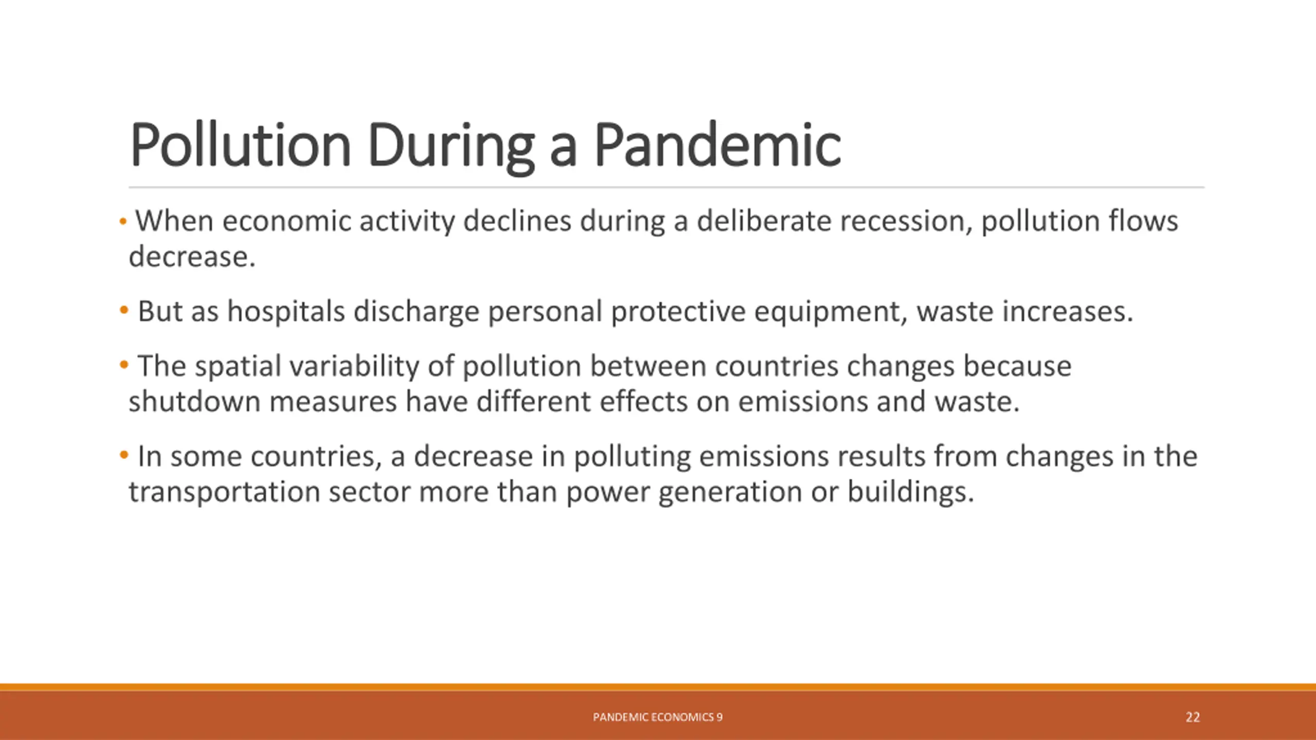 Pollution During a Pandemic Pollution During a Pandemic When economic activity declines during a deliberate recession, pollution flows decrease. But as hospitals discharge personal protective equipment, waste increases. The spatial variability of pollution between countries changes because shutdown measures have different effects on emissions and waste. In some countries, a decrease in polluting emissions results from changes in the transportation sector more than power generation or buildings. 22 PANDEMIC ECONOMICS 9
