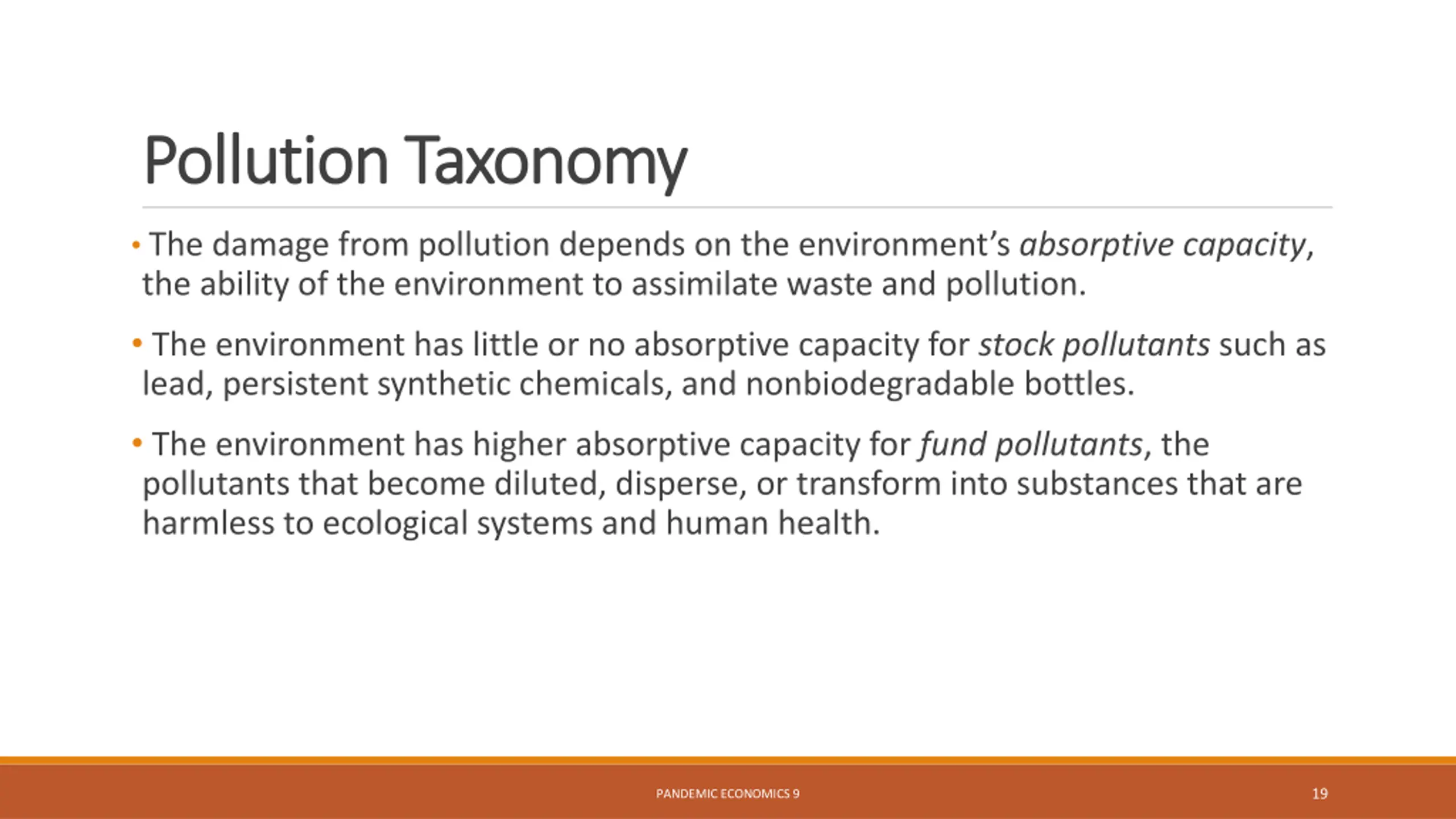 Pollution Taxonomy Pollution Taxonomy The damage from pollution depends on the environment s absorptive capacity, the ability of the environment to assimilate waste and pollution. The environment has little or no absorptive capacity for stock pollutants such as lead, persistent synthetic chemicals, and nonbiodegradable bottles. The environment has higher absorptive capacity for fund pollutants, the pollutants that become diluted, disperse, or transform into substances that are harmless to ecological systems and human health. 19 PANDEMIC ECONOMICS 9